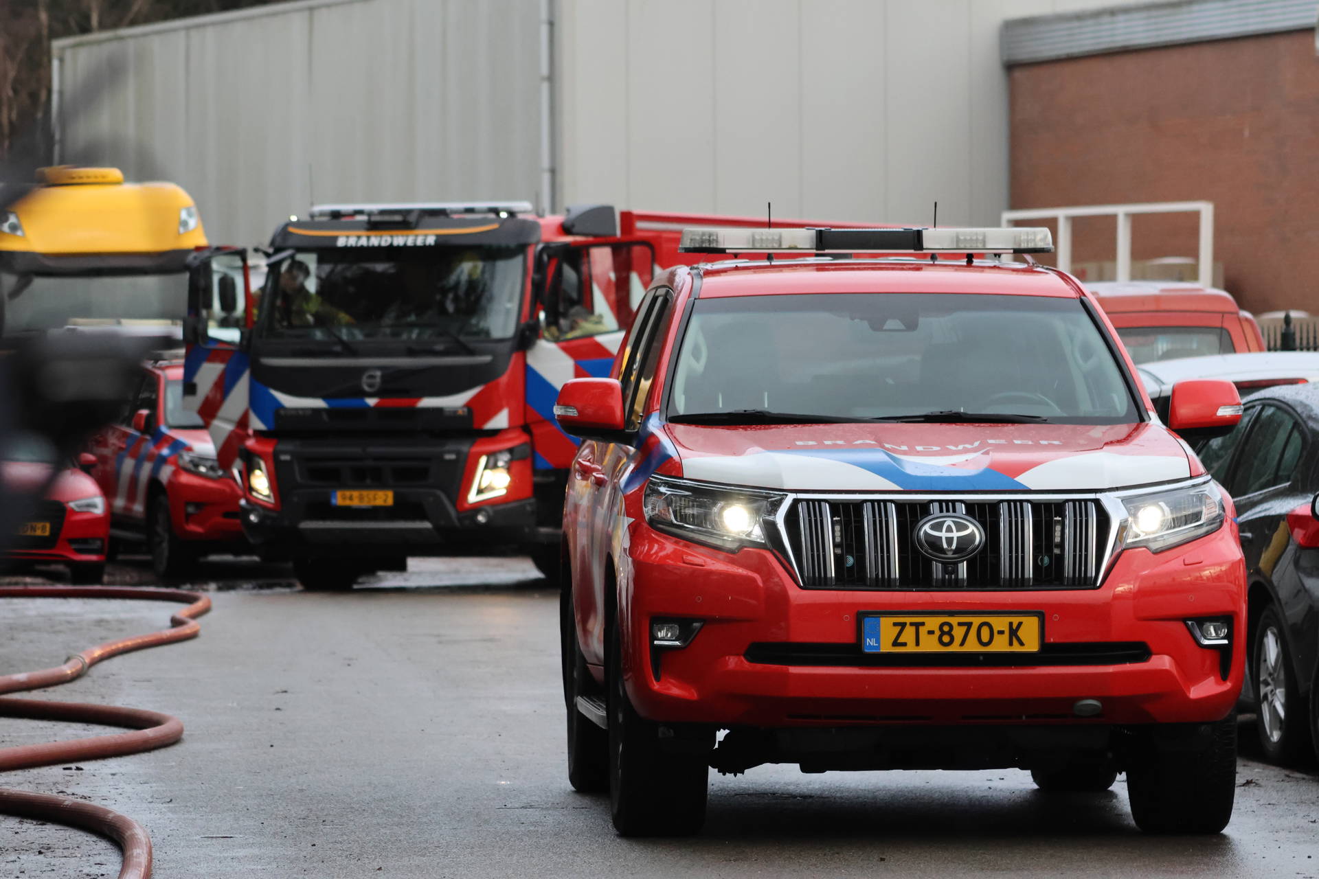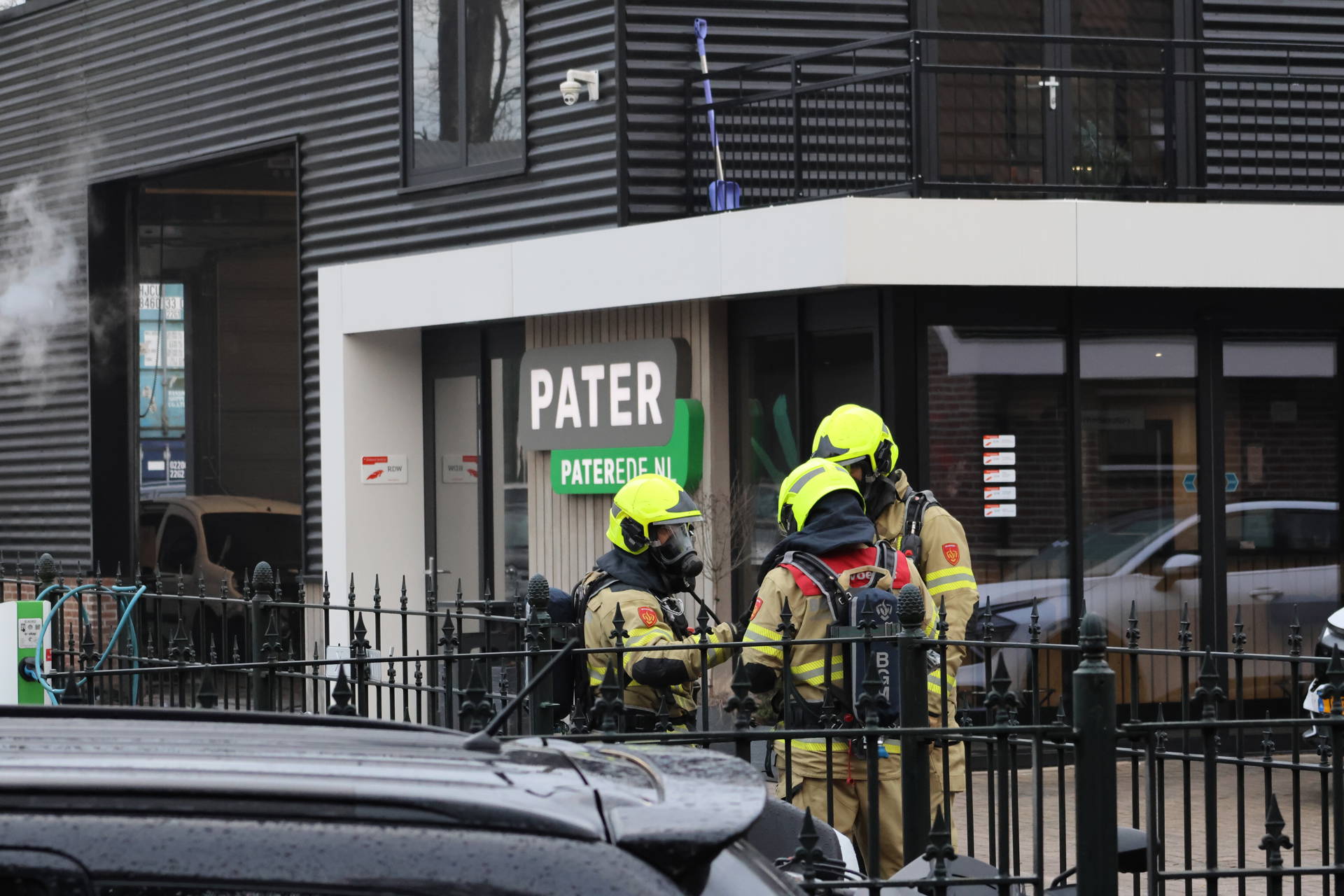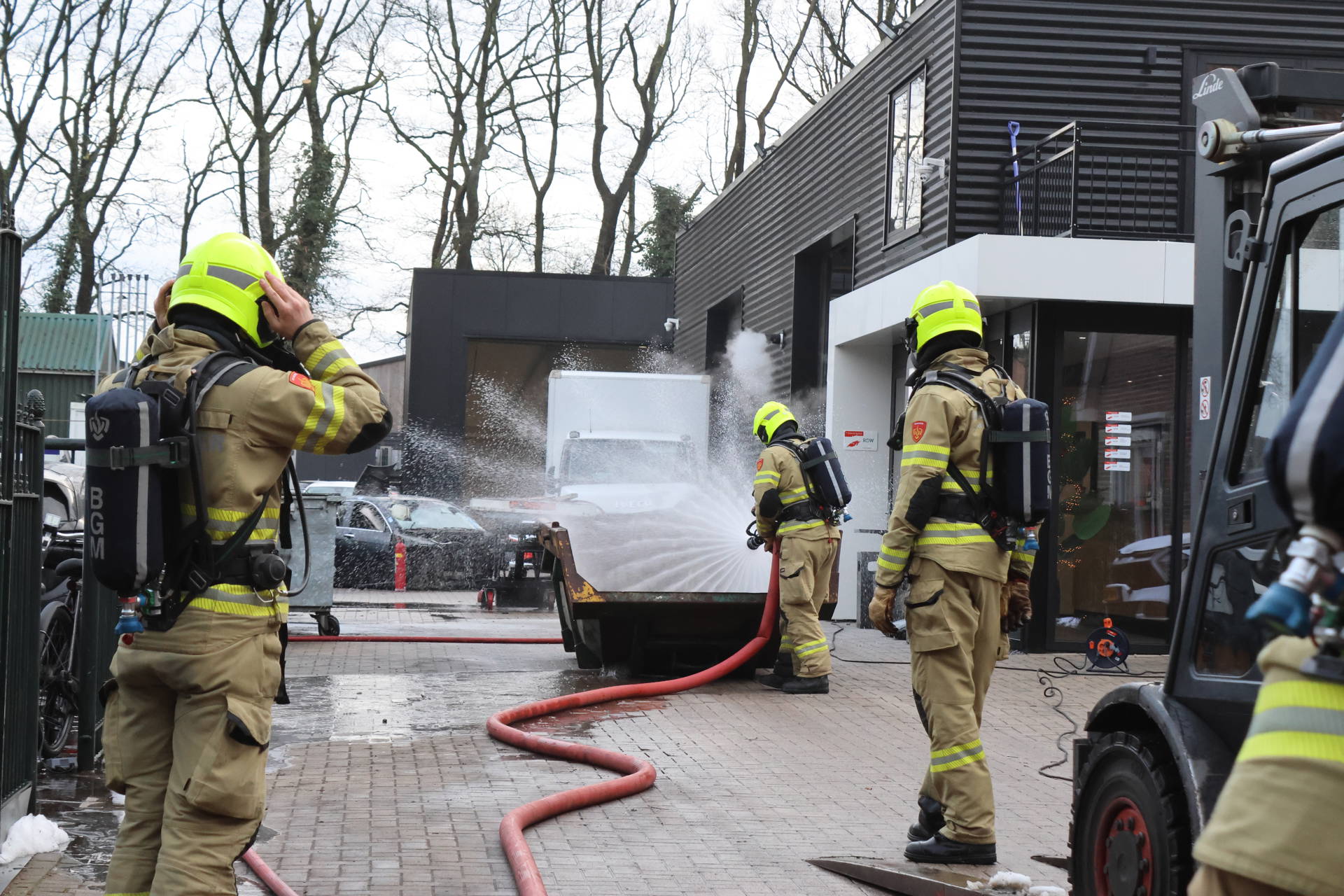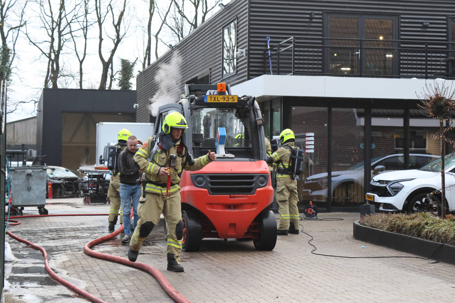 Vanwege de giftige rook dragen alle brandweerlieden ademluchtmaskers. Werknemers konden op tijd het pand verlaten en de garage is ontruimd. De oprit is afgezet als brongebied voor gevaarlijke stoffen, en de milieudienst onderzoekt mogelijke schade.