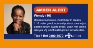 De politie heeft een Amber Alert uitgevaardigd voor de vermissing van de 10-jarige Wendy. Het meisje wordt sinds kort vermist en er bestaan ernstige zorgen over haar veiligheid. Omdat iedere minuut telt, is besloten het zwaarste opsporingsmiddel in te zetten. Via smartphones, snelwegborden, sociale media en nieuwsplatforms is een landelijke oproep verspreid om uit te kijken naar het kind en direct contact op te nemen met de politie bij mogelijke aanwijzingen.