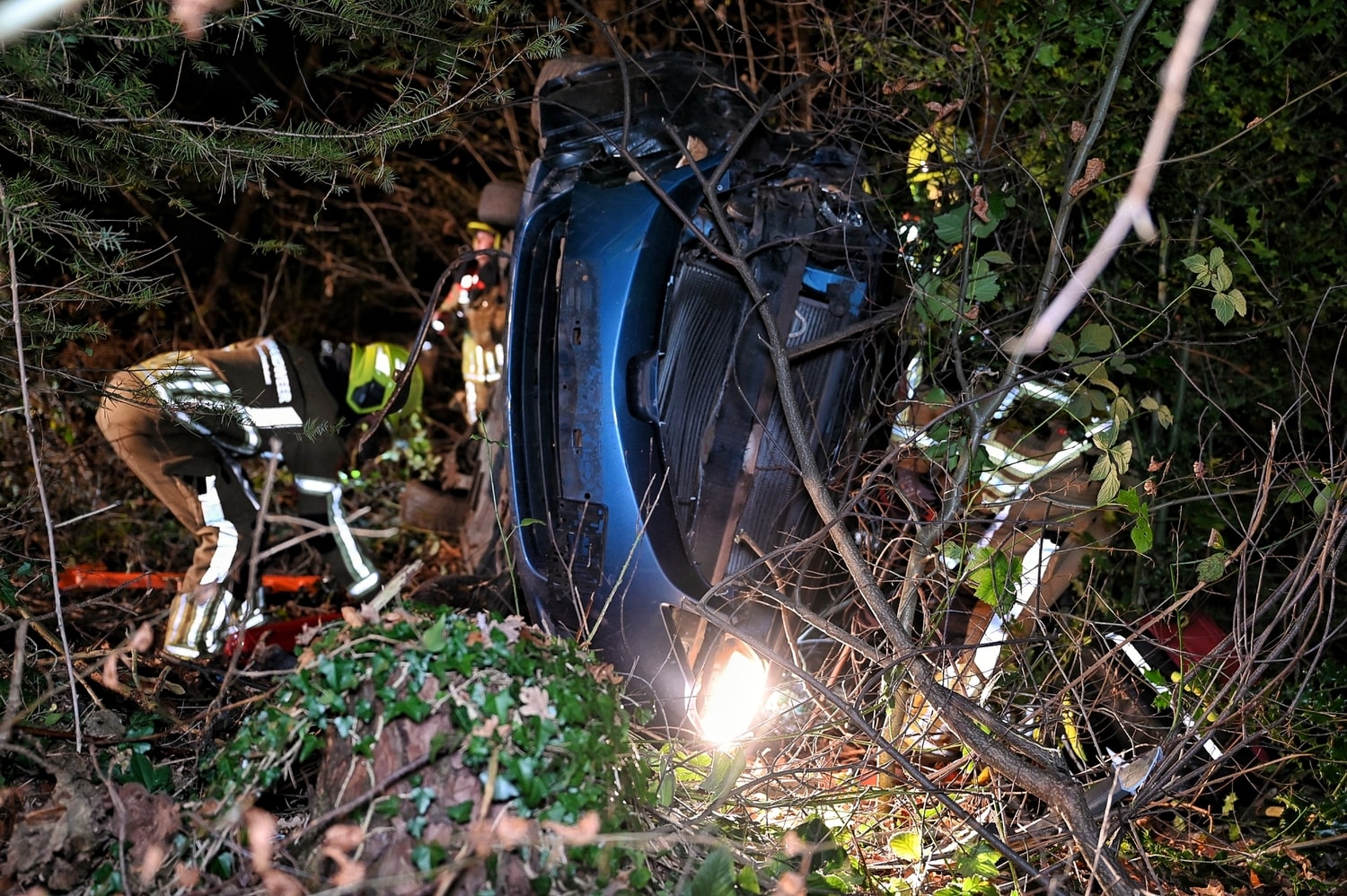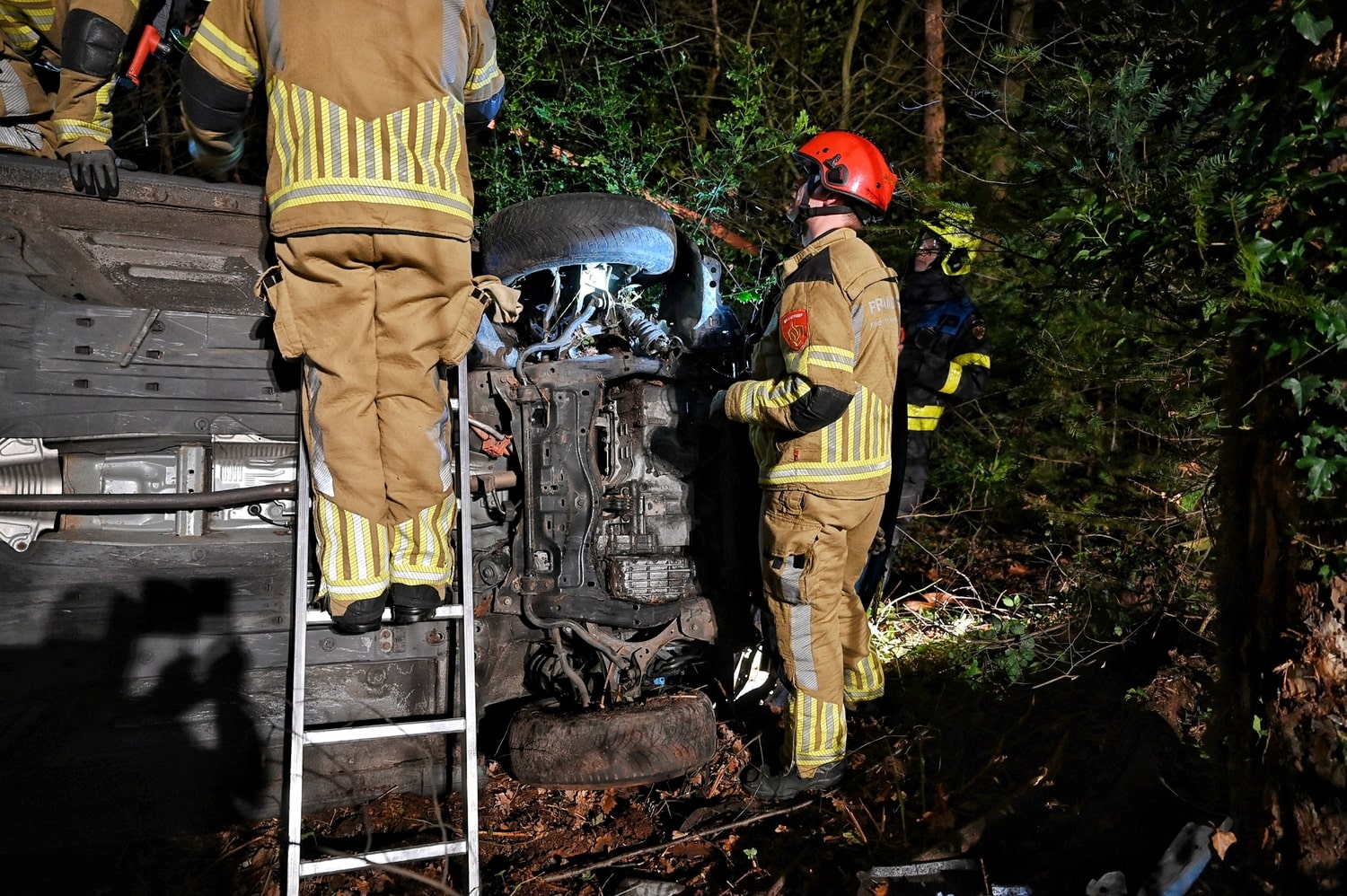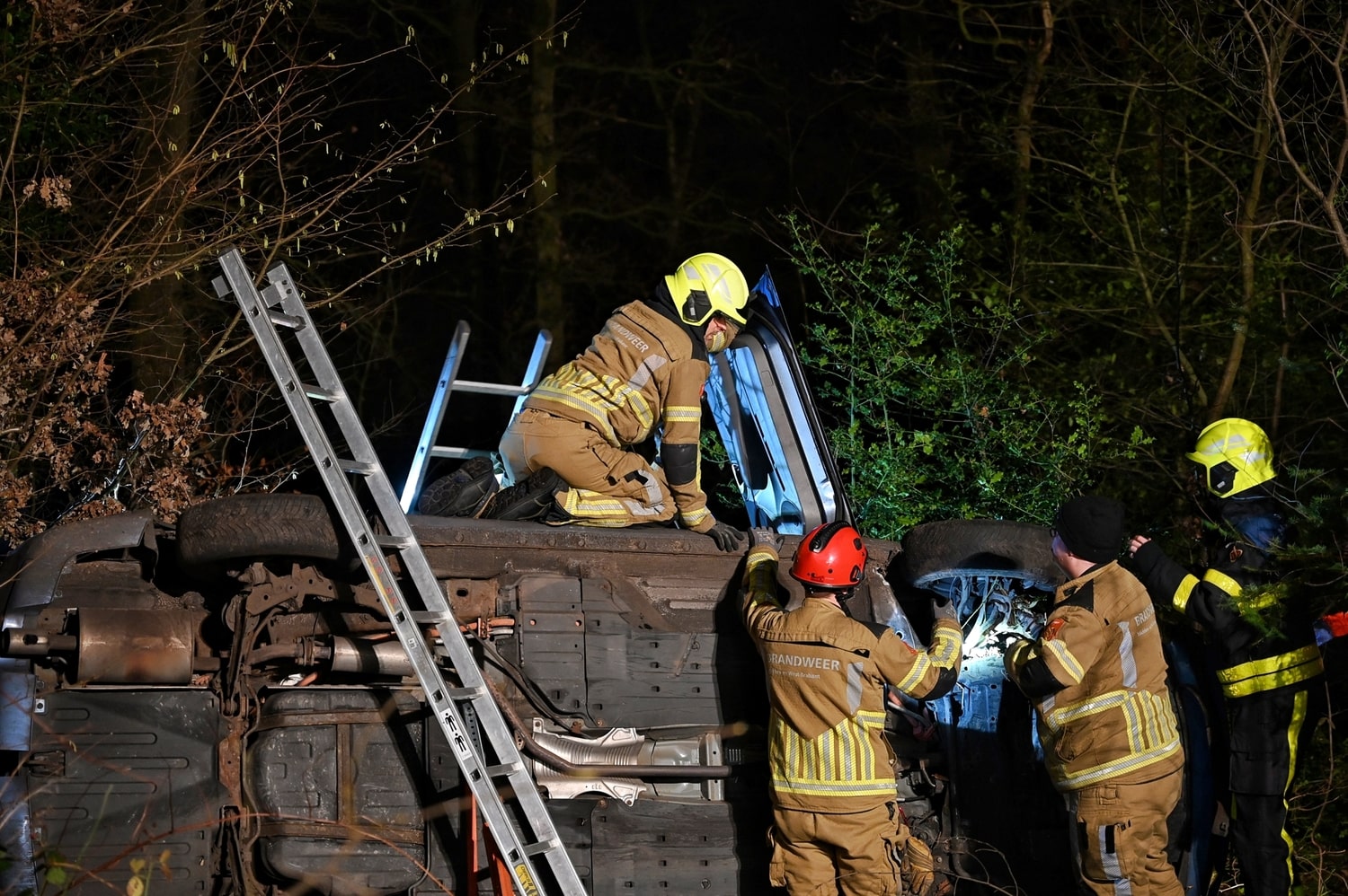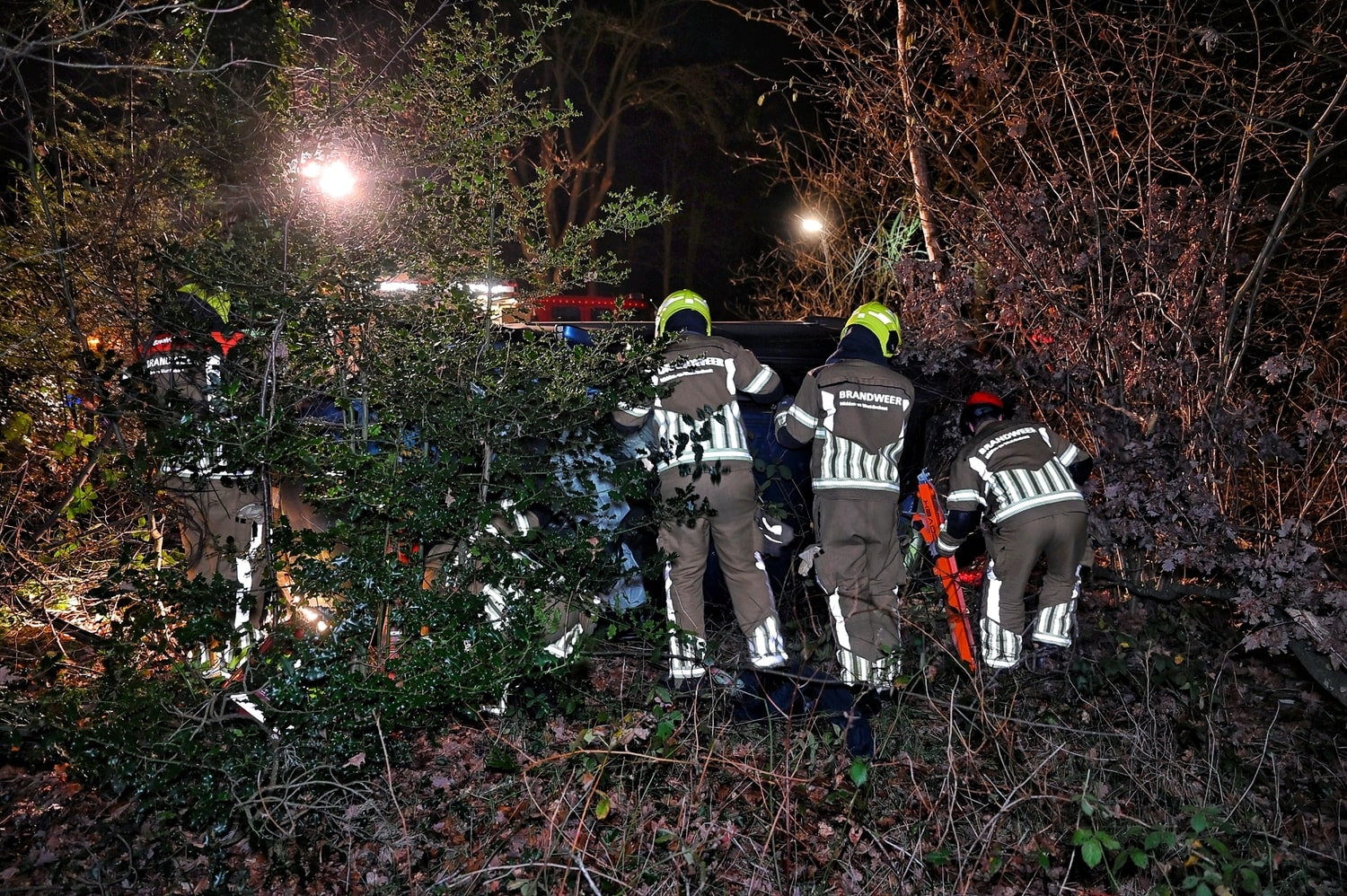 De bestuurder miste vermoedelijk een bocht en kwam in een lastig bereikbare positie tot stilstand. Omdat de auto nauwelijks zichtbaar was vanaf de donkere openbare weg, belde de man zelf 112. De brandweer heeft hem uit het voertuig bevrijd.