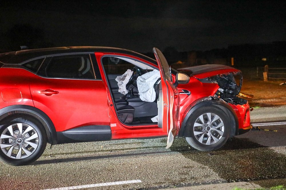 Zowel de auto als de grondbak liepen flinke schade op. De auto wordt afgesleept. Beide bestuurders bliezen negatief.
