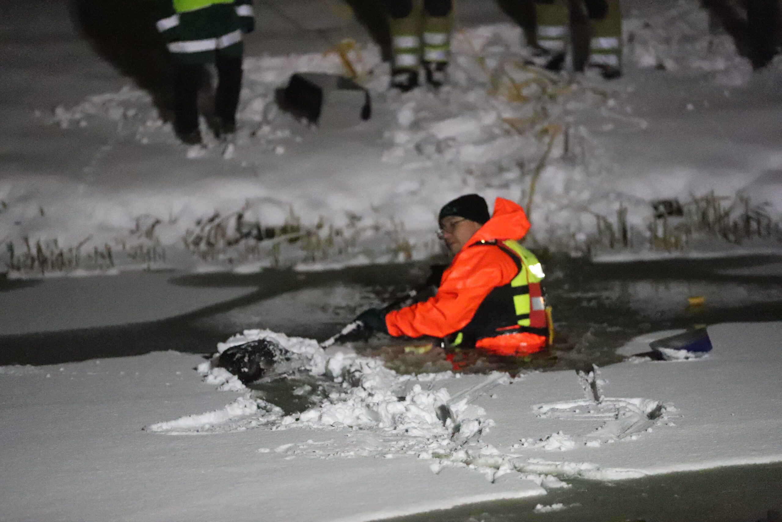 Toen de dierenambulance later wel ter plaatse was, werd de brandweer van Veenendaal opgeroepen. Midden op het ijs zat een eend die zich ogenschijnlijk niet kon verplaatsen. Een brandweerman ging met een waadpak en bats het ijs op, maar moest terugkeren omdat het water in het midden van de vijver te diep bleek.