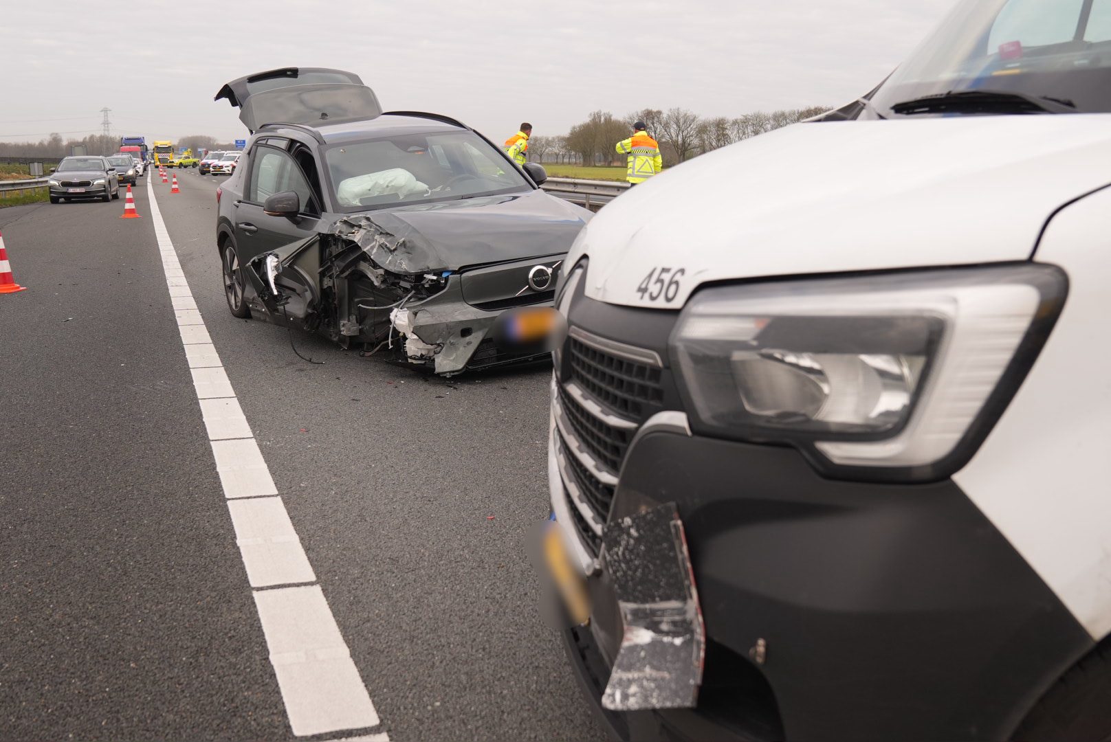 Een bergingsbedrijf heeft het busje weer rechtgezet en beide voertuigen worden afgesleept. Het verkeer wordt over de vluchtstrook langs het ongeval geleid, wat voor file zorgt.