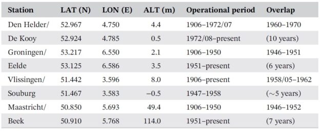 De tabel van figuur 2 toont voor de vier hoekstations de operationele periodes en de periodes van overlap. Verplaatsing van een meetstation heeft altijd invloed op de metingen, net zoals het wisselen van instrumentarium of de meethut. Formeel eindigt dan de oude reeks en begint een nieuwe, maar organisaties als het KNMI willen graag lange meetreeksen, en daarom ‘plakt’ men vaak de nieuwe aan de oude meetreeks.