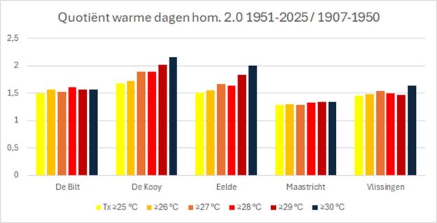 In de ruwe metingen tot 1950 werden 23 hittegolven geteld, na de homogenisatie 1.0 in 2016 werd dat aantal teruggebracht tot 7 en na de homogenisatie 2.0 van 2026 zijn dat er 14 geworden. Ik gebruik voor de vergelijking de periodes 1907 t/m 1950 en 1951-2025, zodat de verhouding voor alle stations gelijk is. Dat is noodzakelijk omdat er relatief weinig warme dagen waren in de koele periode van 1950 tot 1970 (figuur 4). Dit betekent voor De Kooy dat een deel van de gehomogeniseerde data zich in de tweede periode bevindt.