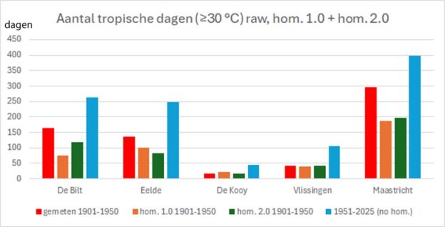 Te sterk, blijkt als we De Bilt vergelijken met de vier hoekstations. Het gemiddelde quotiënt van de hoekstations was 1,34. Het gemiddelde quotiënt van De Bilt vóór de homogenisatie 1.0 was 1,03 en na die homogenisatie 1,88 met als uitschieter de tropische dagen (zwart) met een quotiënt van maar liefst 2,14.