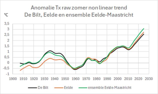 De lijnen betreffen Tx van de zomermaanden, loess gesmoothed en weergegeven als anomalie van het gemiddelde over 1952-1990. Goed te zien is dat Tx in Eelde tot 1950 opmerkelijk lager is dan in De Bilt. Door in de eerste homogenisatie Eelde als enig referentiestation voor De Bilt te gebruiken werd de correctie op De Bilt veel te sterk. Door bij homogenisatie 2.0 als referentie het ensemble van Eelde en Maastricht te gebruiken veranderde de situatie vóór 1951 volledig. In figuur 12 is bij De Bilt te zien dat dat tot gevolg had dat de overcorrectie uiteindelijk werd gecorrigeerd. Je kunt je zelfs afvragen of de grafiek in figuur 13 eigenlijk niet laat zien dat er met de meetgegevens van De Bilt tot 1950 weinig aan de hand was. Misschien zijn die 7 ‘teruggevonden’ hittegolven toch aan de zuinige kant?
