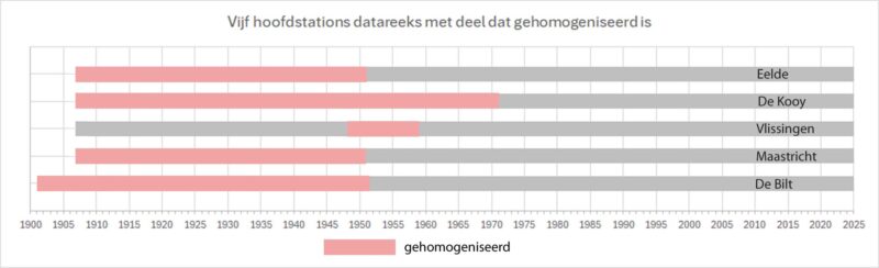 In de grafiek van figuur 3 is de lengte van de meetreeks van elk van de vijf stations weergegeven, alsmede de periode waarover gehomogeniseerd is (roze gekleurd).