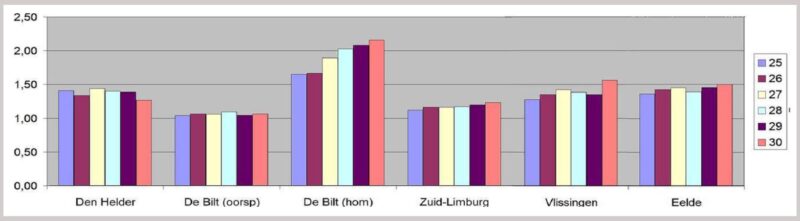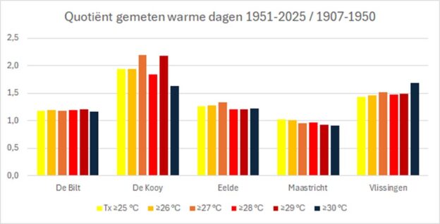 De grafieken in figuur 7 tonen de quotiënten van de gemeten, dus niet-gehomogeniseerde cijfers. De grafieken van Vlissingen en De Kooy steken boven de andere stations uit. Vlissingen heeft een quotiënt van ~1,5, wat betekent dat er in de periode vanaf 1951 zo’n 1,5 keer meer warme dagen gemeten zijn dan in de eerste periode (gecorrigeerd voor het verschil in lengte tussen periode 1 en 2). Vooral de hoge quotiënten in De Kooy vallen op.