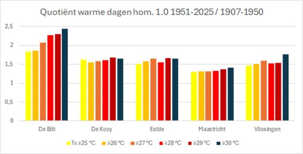 De grafieken in figuur 10 zijn gemaakt op basis van de gehomogeniseerde data (1.0) uit 2016. Alle vijf stations tonen in figuur 7 quotiënten die hoger zijn dan 1, dat wil zeggen dat er relatief méér warme dagen geteld werden in de periode vanaf 1951 dan ervoor. Dat past bij de opwarming van Nederland vanaf ± 1980 tot heden (zie figuur 4). De meeste stations lopen nu netjes in de maat, alleen De Bilt valt op door een hoog quotiënt van gemiddeld 2. Dat wijst op een sterke overcorrectie door de homogenisatie van De Bilt, een homogenisatie die van de 23 hittegolven tot 1950 er maar liefst 16 liet verdwijnen. Zie het hittegolfrapport.