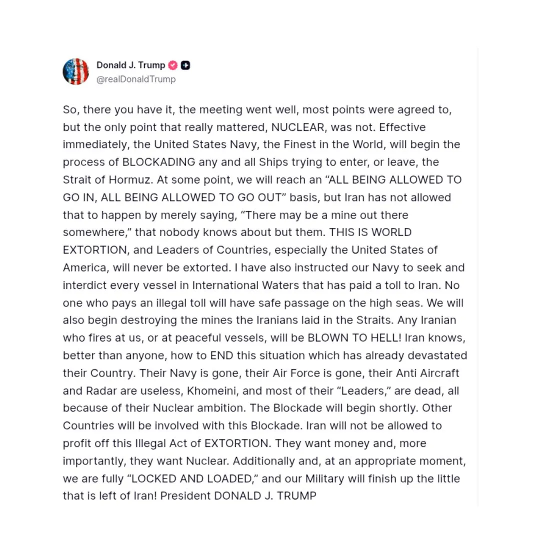 Dus daar heb je het, de bijeenkomst verliep goed, over de meeste punten werd overeenstemming bereikt, maar het enige punt dat er echt toe deed, KERNWAPENS, niet. Met onmiddellijke ingang zal de Amerikaanse marine, de beste ter wereld, beginnen met het proces van het BLOKKEREN van alle schepen die proberen de Straat van Hormuz binnen te varen of te verlaten. Op een gegeven moment zullen we komen tot een situatie waarin ‘IEDEREEN NAAR BINNEN MAG, IEDEREEN NAAR BUITEN MAG’, maar Iran heeft dat verhinderd door simpelweg te zeggen: ‘Er zou ergens een mijn kunnen liggen’, waarvan niemand behalve zij weet. DIT IS WERELDWIJDE AFZETTERIJ, en leiders van landen, vooral de Verenigde Staten van Amerika, zullen zich nooit laten afpersen. Ik heb onze marine ook opgedragen elk schip in internationale wateren op te sporen en te onderscheppen dat tol heeft betaald aan Iran. Niemand die een illegale tol betaalt, zal veilige doorgang hebben op volle zee. We zullen ook beginnen met het vernietigen van de mijnen die de Iraniërs in de zeestraat hebben gelegd. Elke Iraniër die op ons schiet, of op vreedzame schepen, zal VOLLEDIG VERNIETIGD WORDEN! Iran weet beter dan wie ook hoe deze situatie moet eindigen, die hun land al heeft verwoest. Hun marine is weg, hun luchtmacht is weg, hun luchtafweer en radar zijn nutteloos, Khomeini en de meeste van hun ‘leiders’ zijn dood, allemaal vanwege hun nucleaire ambitie. De blokkade zal spoedig beginnen. Andere landen zullen betrokken worden bij deze blokkade. Iran zal niet mogen profiteren van deze illegale daad van AFZETTERIJ. Ze willen geld en, nog belangrijker, ze willen kernwapens. Bovendien zijn wij op het juiste moment volledig ‘KLAAR VOOR ACTIE’, en ons leger zal afmaken wat er nog van Iran over is!