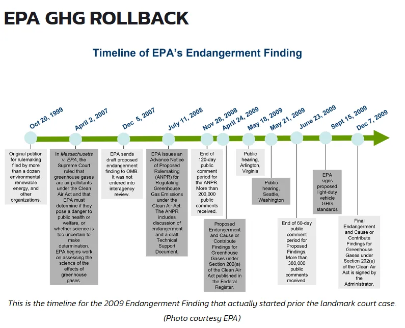 De Endangerment Finding van de EPA volgde destijds op de uitspraak van het Hooggerechtshof in de zaak Massachusetts v. EPA, die alleen maar toestond dat broeikasgassen in aanmerking werden genomen in het kader van de Clean Air Act. De EPA werd niet verplicht om kooldioxide als een gevaar voor de volksgezondheid of het welzijn aan te merken. Dat oordeel werd aan de instantie zelf overgelaten.