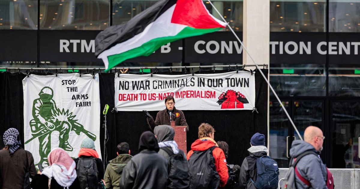 Diverse actiegroepen demonstreren tegen de jaarlijkse wapenbeurs NIDV Exhibition for Defence and Security (NEDS). Aan de stellage hingen spandoeken met teksten als ‘Stop wapenhandel Fok Fokker’ en ‘Stop profiting from genocide. No more F-35 parts to Israel’. De arrestanten behoren tot de actiegroep Fok Fokker, die wil dat vliegtuigonderdelenbouwer Fokker stopt met de productie van onderdelen voor de F-35, die bij het Israëlische leger zouden belanden. Deze groep bezette twee weken geleden een pand van Fokker in Papendrecht.