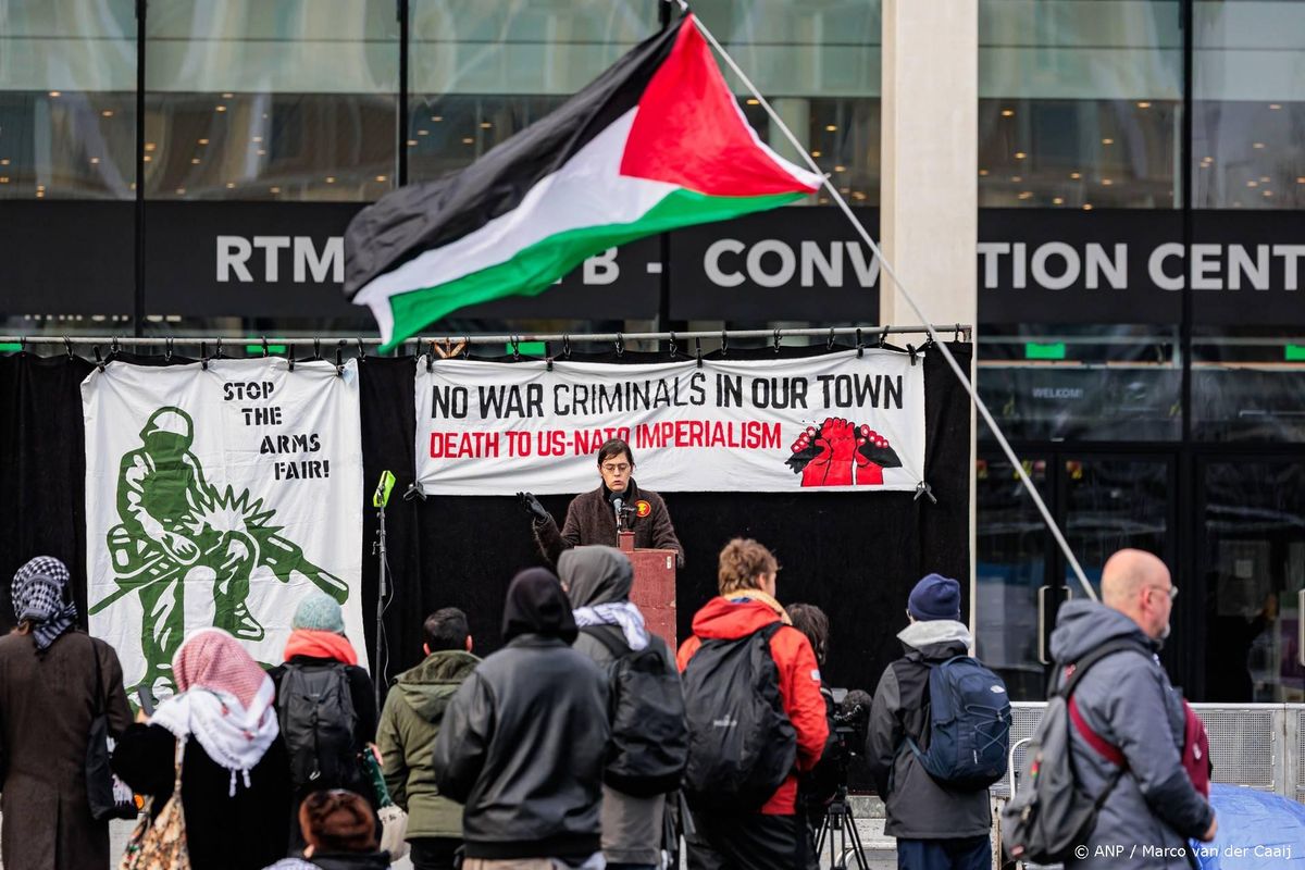 ROTTERDAM (ANP) – De politie heeft negen demonstranten aangehouden bij het protest tegen de wapenbeurs in Rotterdam. Het gaat om zeven betogers, die met bedekte gezichten op een stellage met reclameborden waren geklommen op het plein bij evenementencomplex Ahoy. Toen ze niet luisterden naar de oproep hiervan af te komen, werden ze opgepakt. Later zijn nog twee mensen aangehouden voor het bekladden van het pand met rode verf, bevestigt een woordvoerder van de politie.