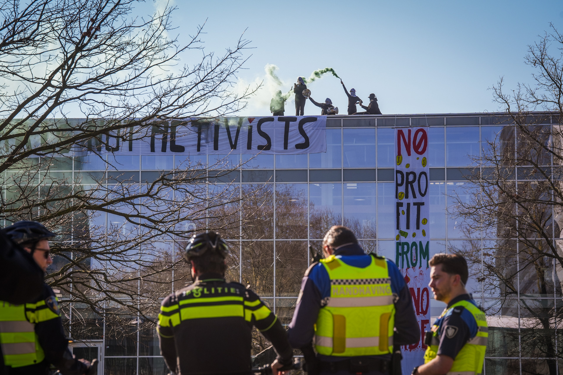 De politie is ter plaatse en overlegt met de beveiliging over hoe de actievoerders veilig naar beneden kunnen worden gebracht. Vooralsnog is niet ingegrepen.