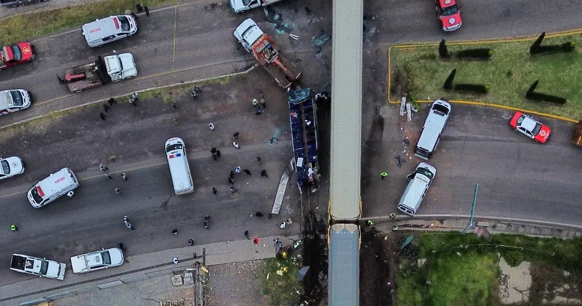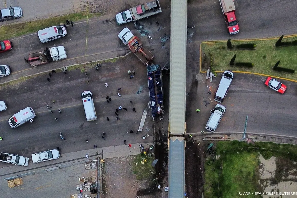 Het ongeluk vond maandag plaats in een industriegebied zo’n 115 kilometer ten noordwesten van Mexico-Stad. Op beelden van de locatie van het ongeval is te zien dat de voorkant van het bovendek van de bus is ingeslagen en dat het metalen frame ernstig is gedeukt.
