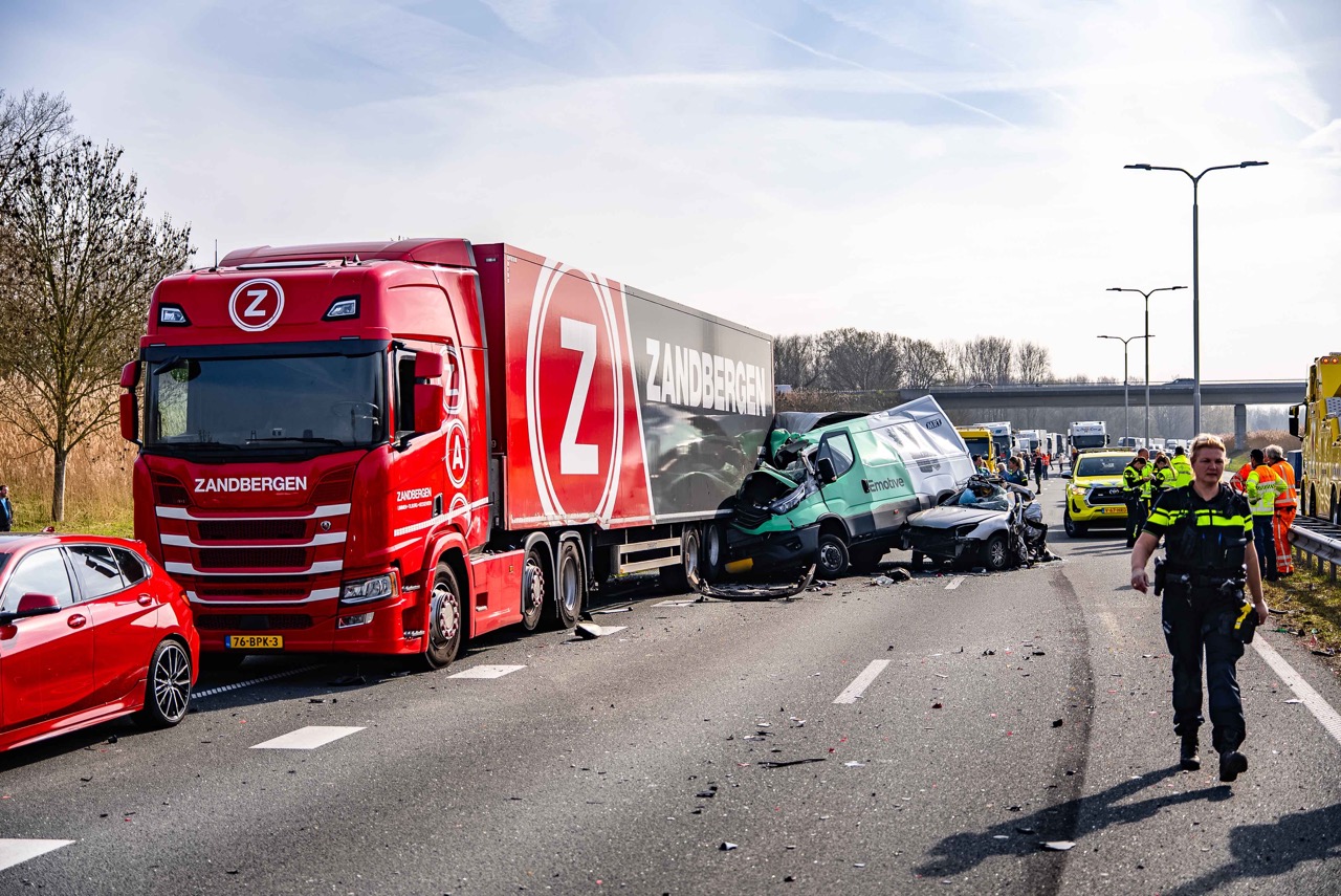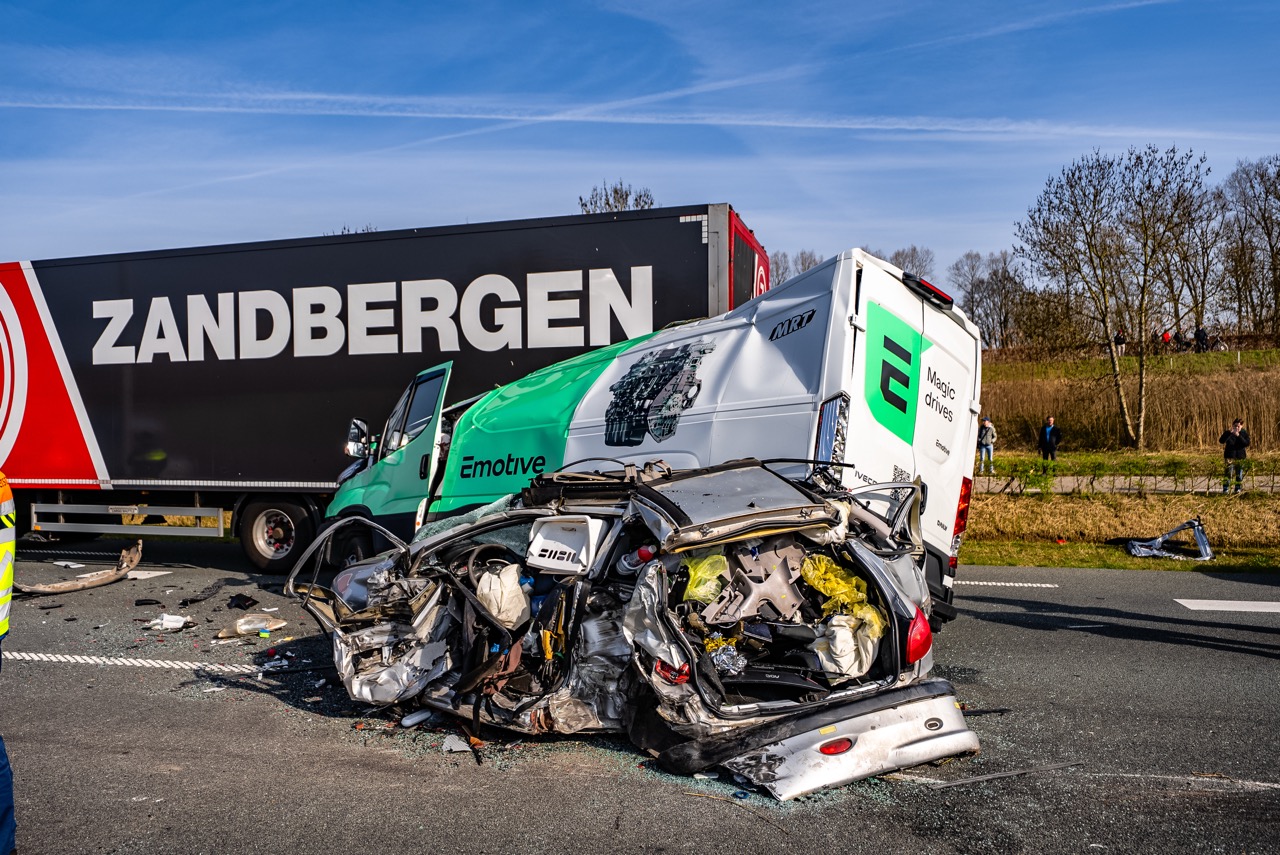 Bij het ongeval botsten een bestelbus en een personenauto hard achter op een vrachtwagen. De bestelbus raakte zwaar beschadigd en lijkt total loss. Ook een andere auto liep flinke schade op en een voertuig belandde in de sloot langs de weg.