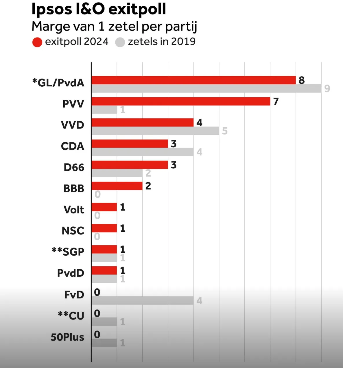 De vraag is alleen welke zetels? Komt FVD toch nog uit op een zetel? Wordt GroenLinks-PvdA echt de grootste of slaat de PVV alsnog toe? En komen het CDA én D66 uit op 3 zetels in Europa? Of vallen ze nu dan toch een beetje terug?