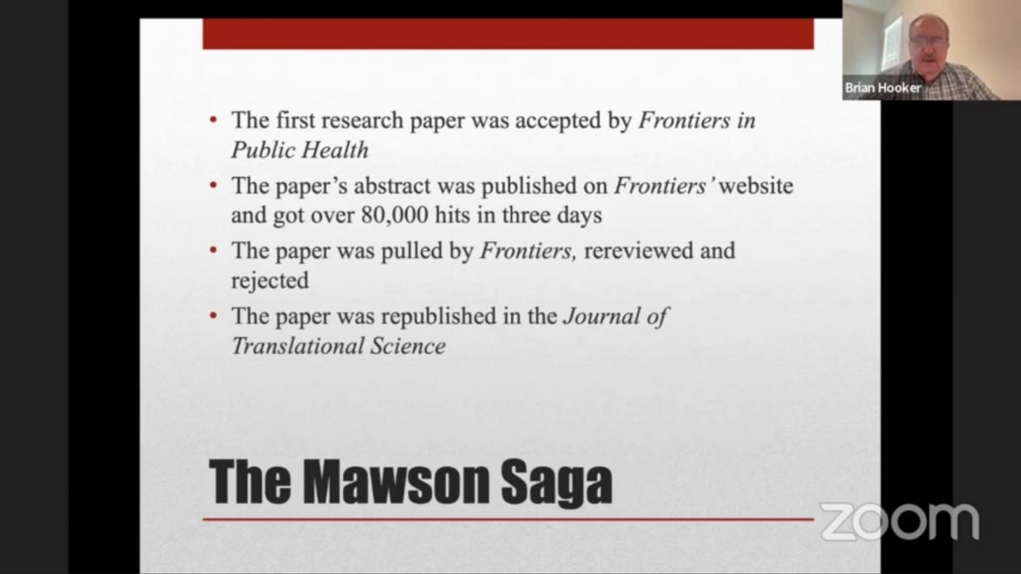 Het onderzoekspaper van Dr. Mawson werd aanvankelijk gepubliceerd in het tijdschrift Frontiers in Public Health en kreeg veel aandacht, met meer dan 80.000 views binnen de eerste drie dagen. Na veel aandacht heeft het tijdschrift het artikel vervolgens verwijderd en verklaard dat het ondanks de eerdere publicatie nooit volledig was geaccepteerd. Het artikel onderging een nieuwe ronde van peer review en werd uiteindelijk afgewezen door Frontiers. Dr. Mawson liet zich niet afschrikken door deze gang van zaken en publiceerde zijn paper in 2017 opnieuw in het Journal of Translational Science.
