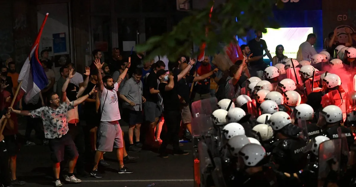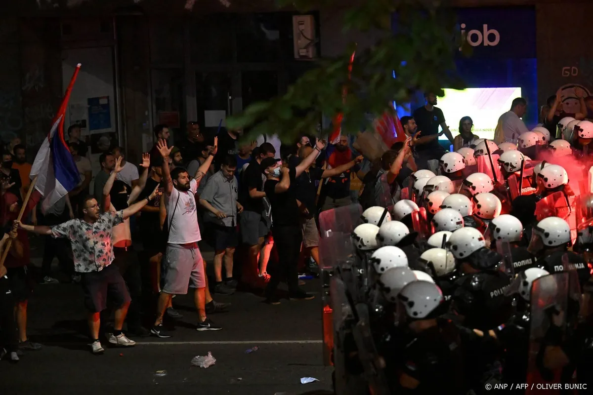Het protest was vlak bij het parlement, waar ook duizenden aanhangers van de regering samenkwamen en een tentenkamp hebben ingericht, dat Vucic zaterdag bezocht. De president hintte er toen op dat in de avond geweld zou uitbreken. Na wat schermutselingen tussen beide groepen, trad de oproerpolitie op tegen de antiregeringsdemonstranten. Ze gebruikte traangas en stungranaten.