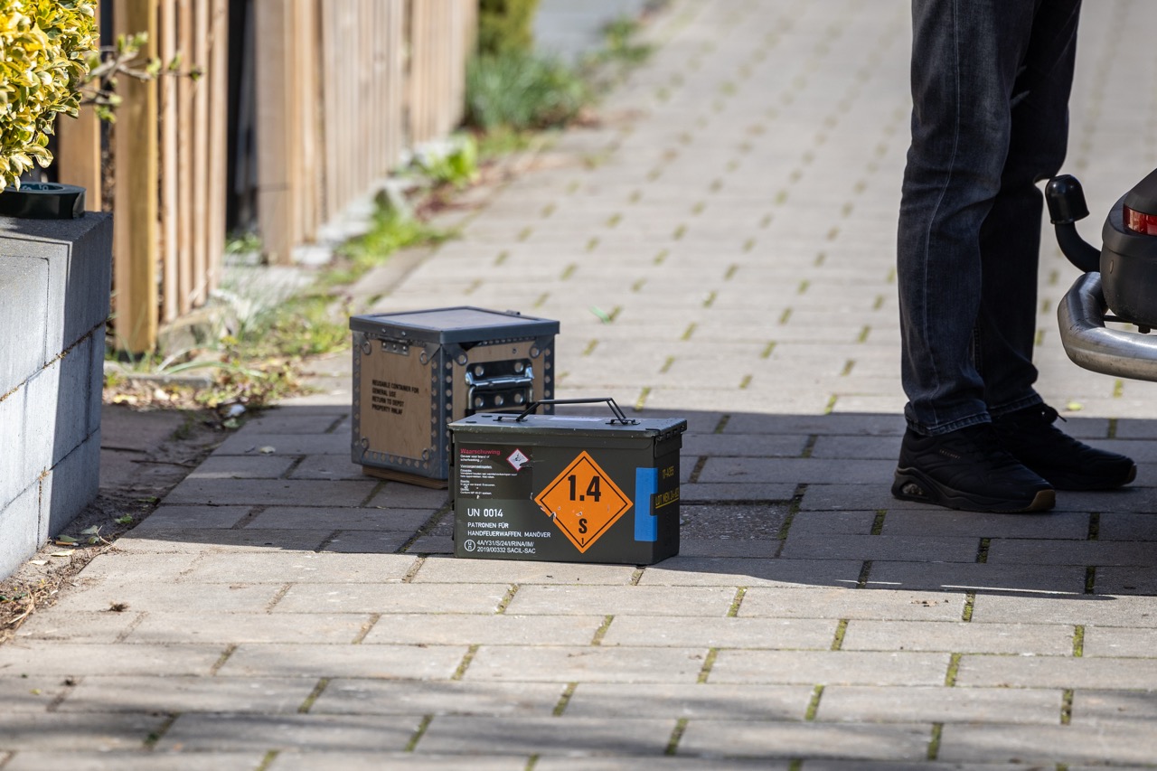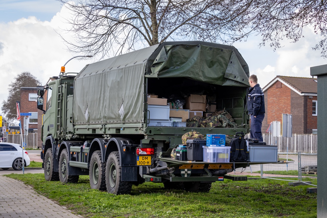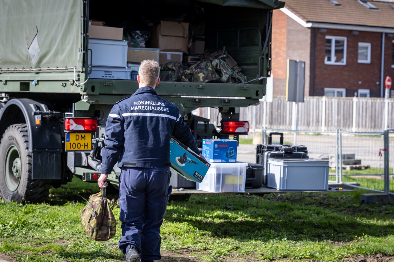 Volgens aanwezigen gaat het om een grote hoeveelheid materieel, waaronder kogelwerende helmen, kogelwerende vesten, kleding, veldbedden, tenten, tassen, messen, tablets, munitiekisten en gereedschap. De Koninklijke Marechaussee heeft één verdachte aangehouden en doet verder onderzoek.