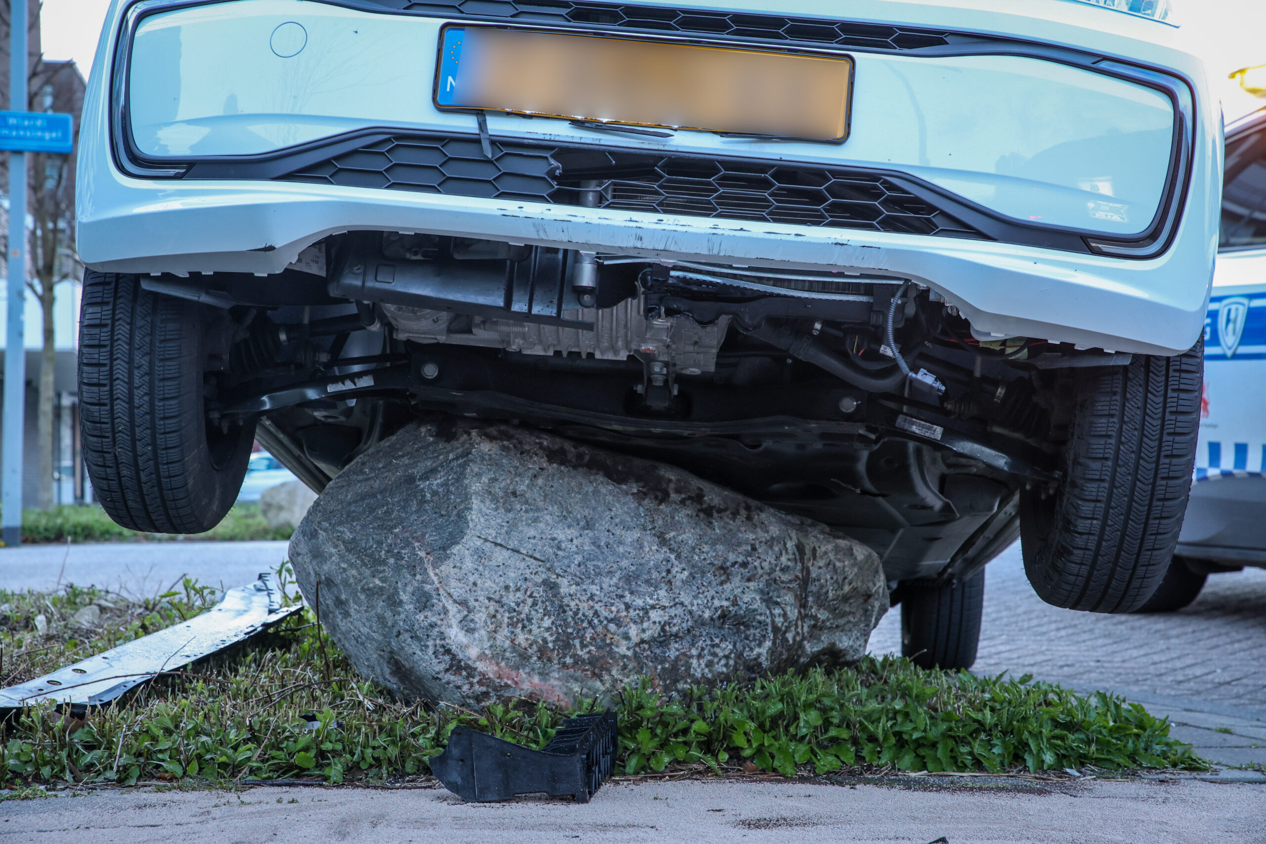Het is onduidelijk waardoor de auto op de kei belandde. De brandweer werd ingeschakeld en heeft het voertuig gecontroleerd. Ondanks een vloeistoflekkage was er geen sprake van een gevaarlijke situatie.