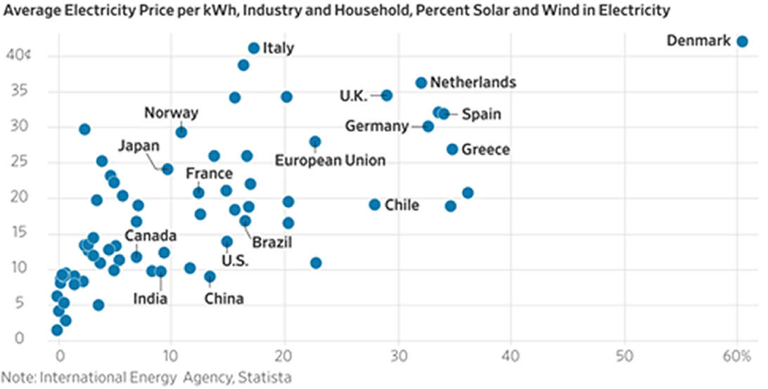 De klimaatparagraaf in het regeerakkoord heet: Op koers voor het klimaat en groene groei. Hoewel de economische groei van de EU al jaren flink achterblijft bij die van de VS en China, blijven onze bestuurders geloven in ‘groene groei’: “We zijn ervan overtuigd dat een innovatief klimaatbeleid en duurzame economische groei twee kanten zijn van dezelfde medaille.” Waaruit dat zou moeten blijken wordt echter niet duidelijk. Zoals eerder hier beschreven staat de chemische industrie in Nederland en Duitsland op omvallen als gevolg van de hoge energieprijzen. Internationaal blijkt er een duidelijke relatie tussen het percentage ‘duurzame’ energie (met name zon en wind) en de hoogte van elektriciteitsprijzen.
