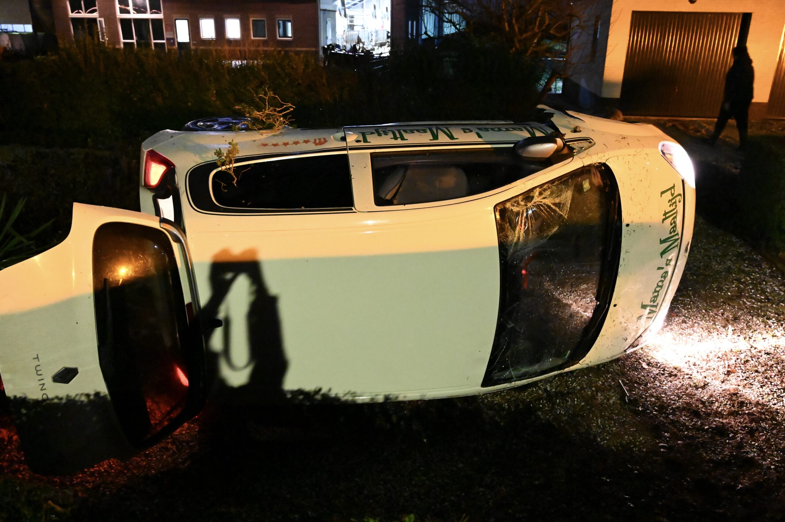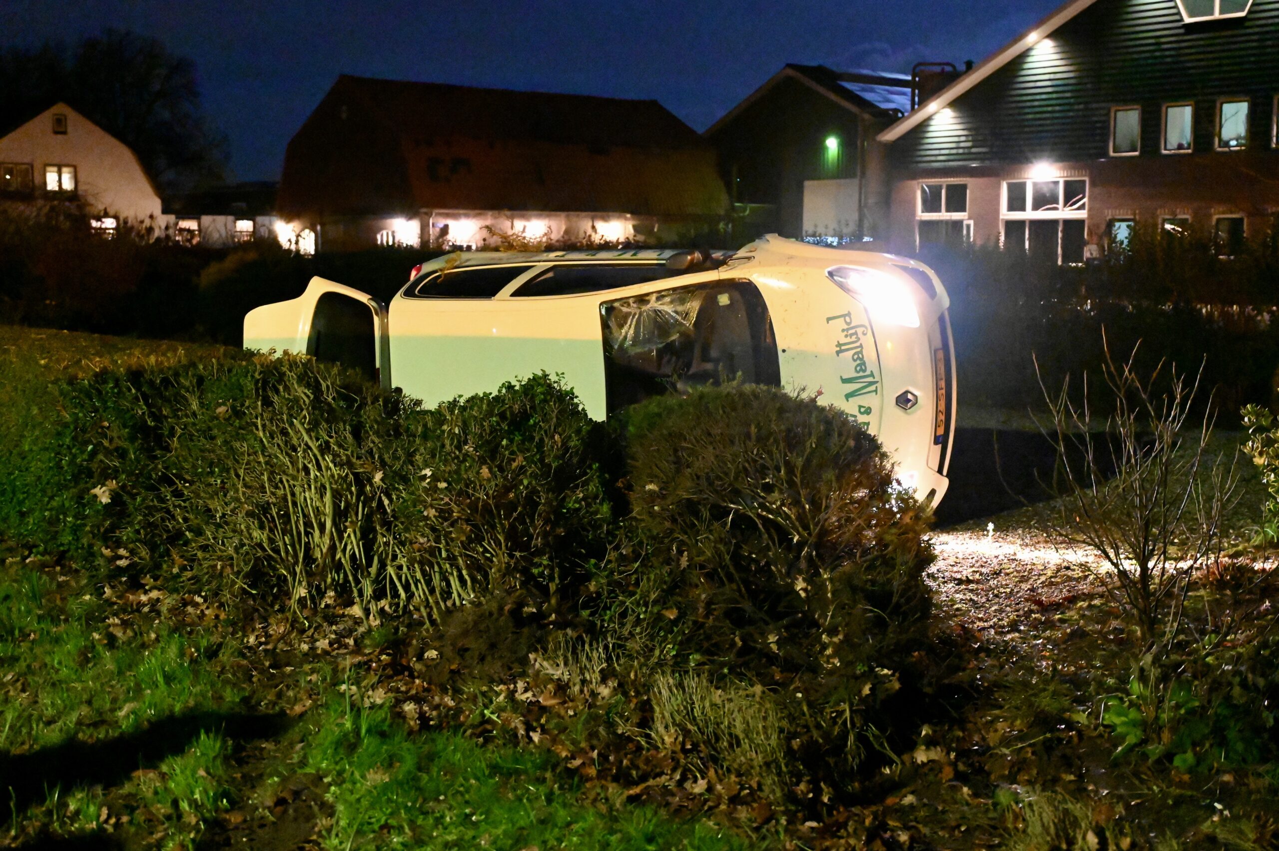 De melding van het ongeval kwam om 18:48 uur binnen. Een witte Renault, afkomstig van een lokale bezorgdienst, gleed door een ijslaag op het wegdek de berm in. De bestuurder probeerde te corrigeren, maar het voertuig kantelde en kwam op de zijkant tot stilstand in de tuin van een woning.