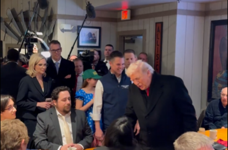 Tijdens een stop bij het Machine Shed restaurant in Urbandale, Iowa, op 27 januari 2026, voorafgaand aan een toespraak in het Des Moines-gebied om zijn campagne voor de tussentijdse verkiezingen van 2026 te starten, stemde president Trump in met het verzoek van een klant om met hem te bidden.