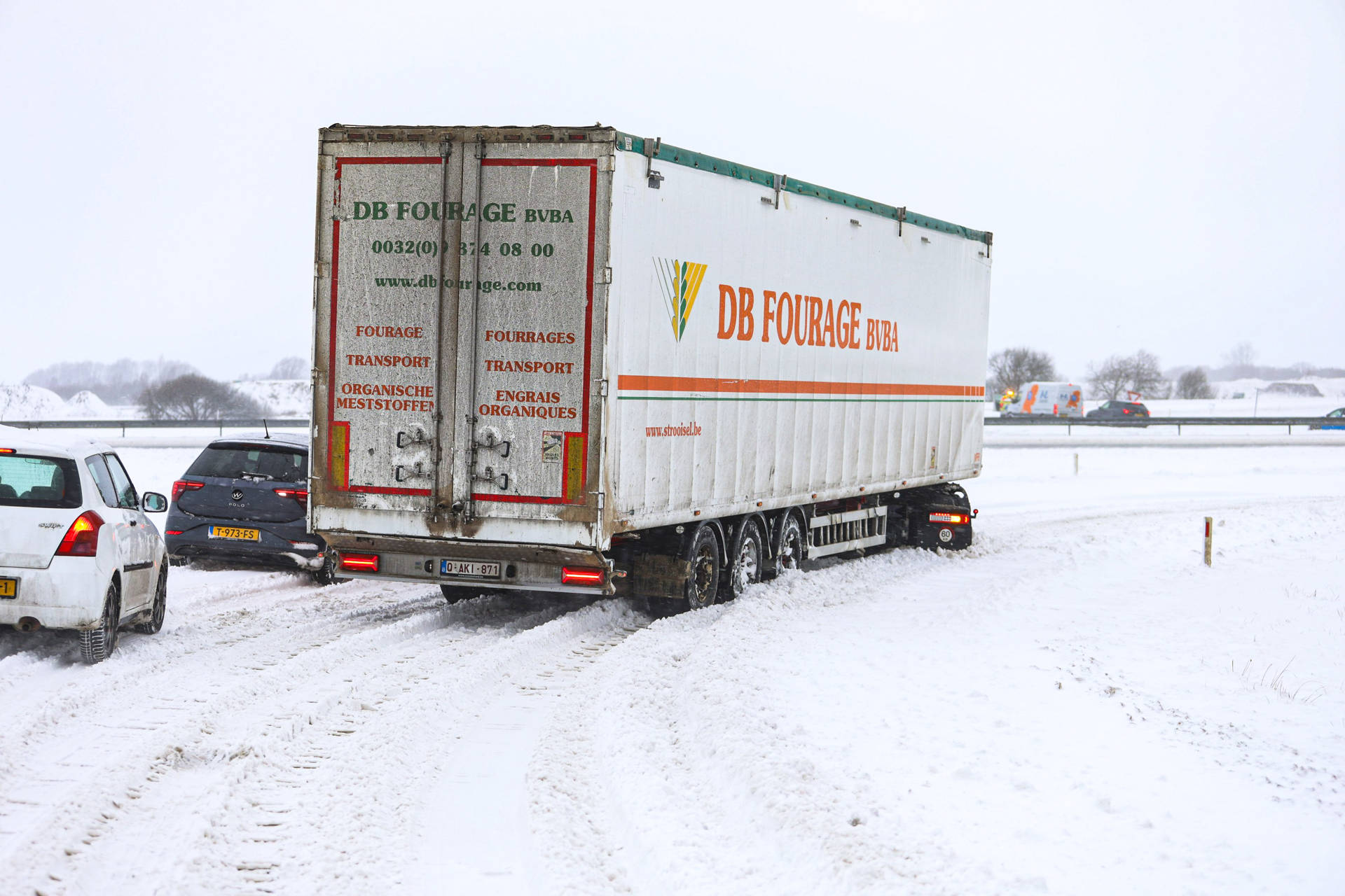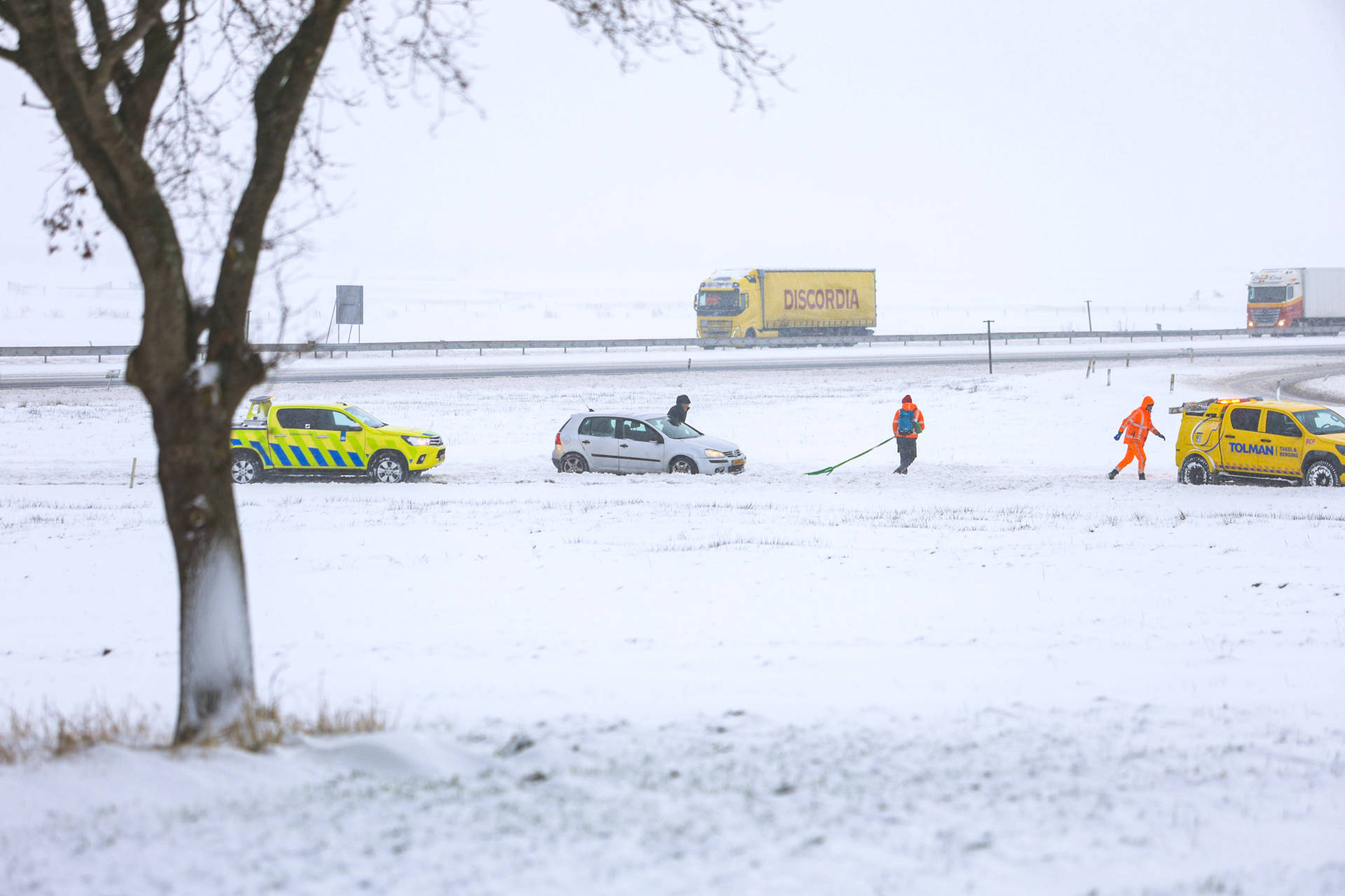 Aan de andere kant van de weg strandde een vrachtwagen op de afrit. Een politiebus probeerde de vrachtwagen los te trekken, maar zonder succes. Uiteindelijk lukte het een voertuig van Rijkswaterstaat om de vrachtwagen weer in beweging te krijgen.