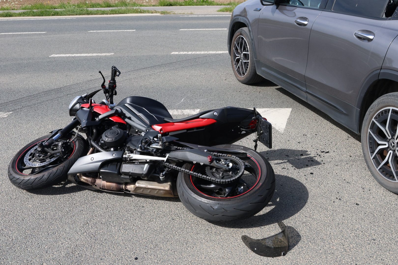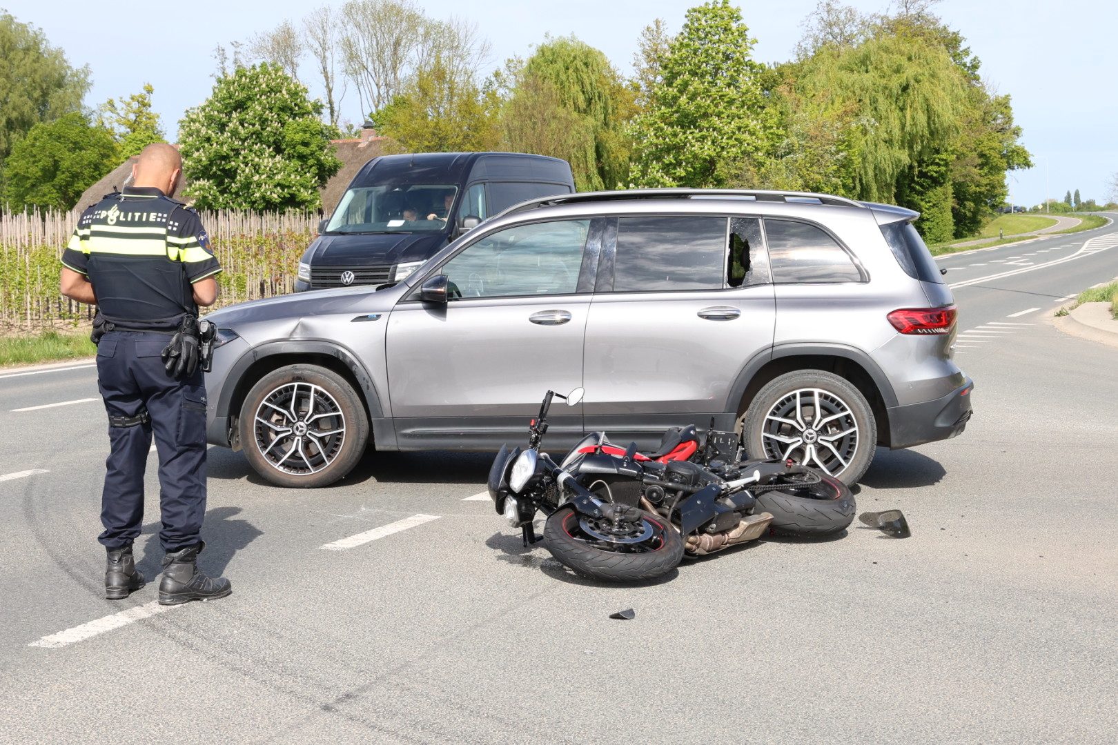 Een personenauto en een motor kwamen met elkaar in botsing. De motorrijder kwam ten val en werd per ambulance naar het ziekenhuis gebracht. De auto liep schade op aan de zijruit en een deuk in de flank.