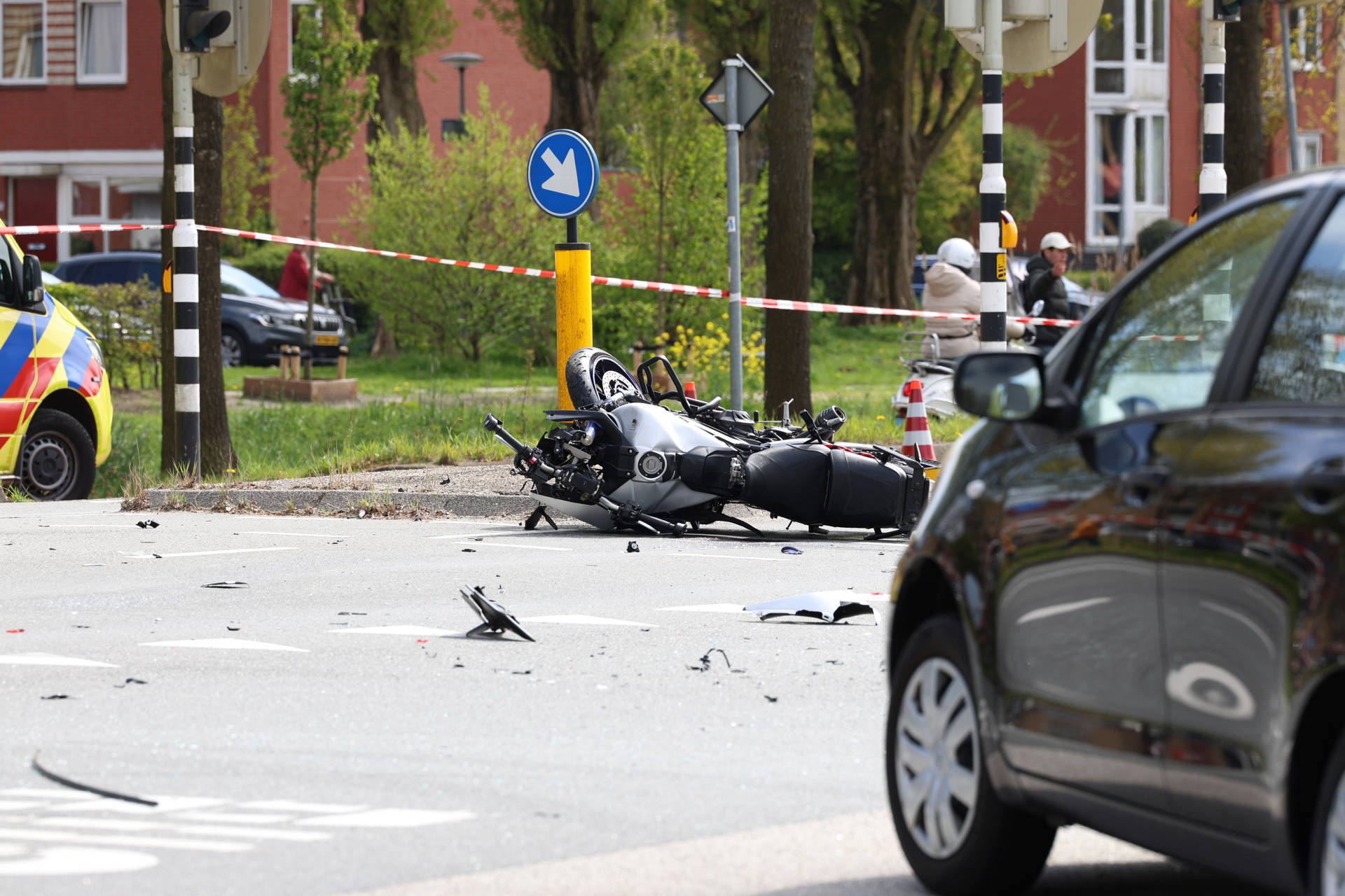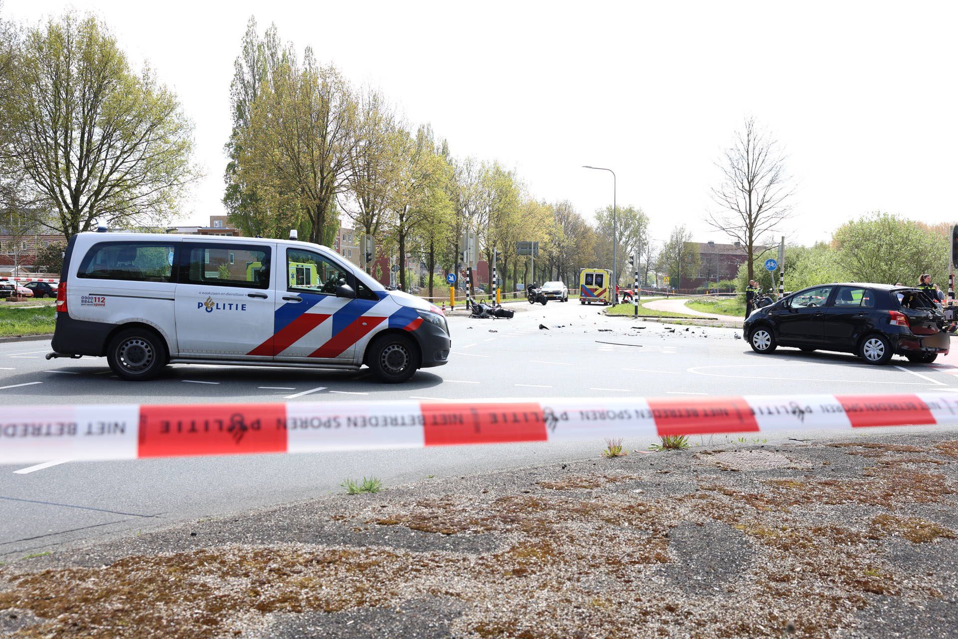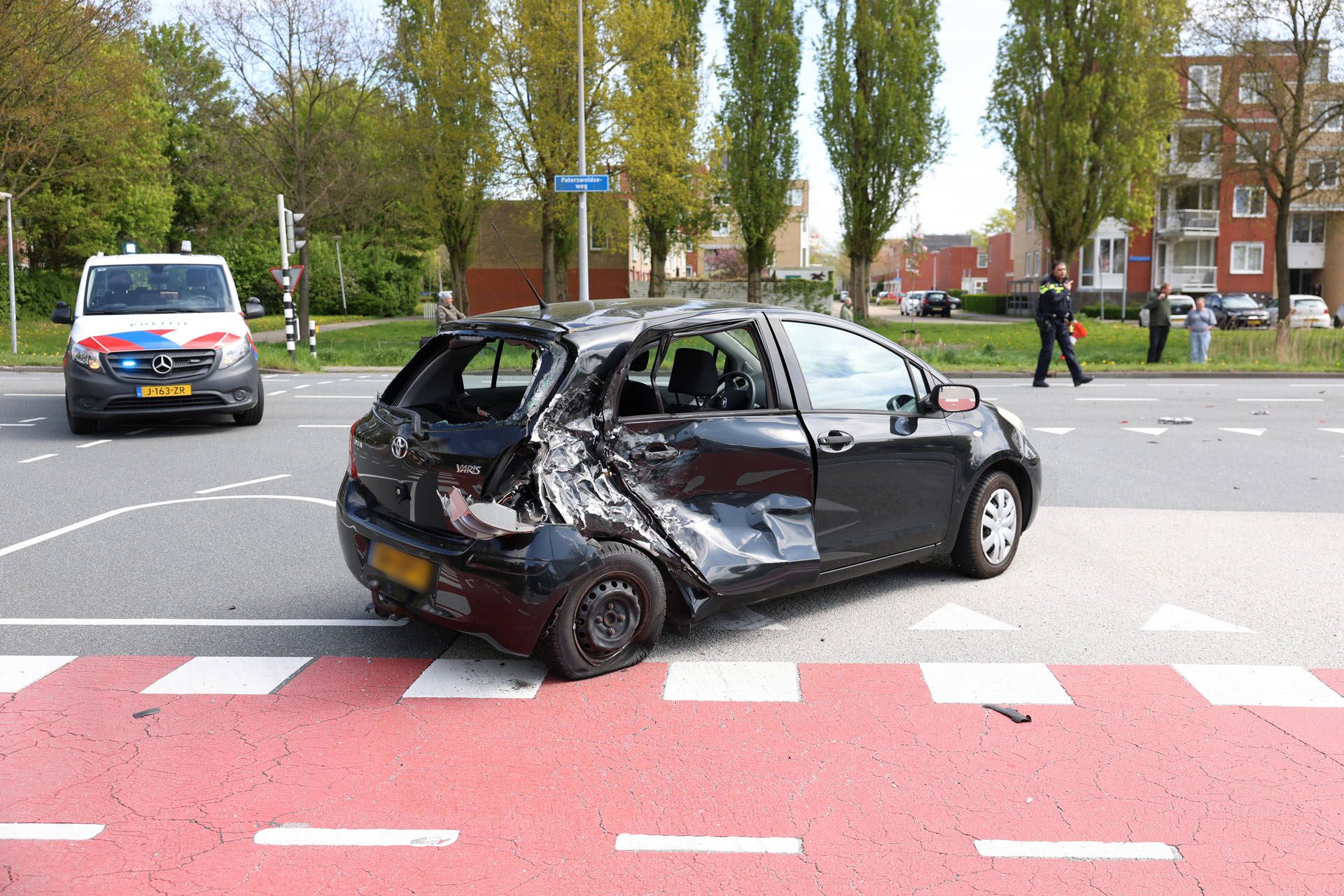 Op de kruising van de Paterwoldseweg met de Van Swietenlaan lagen brokstukken verspreid over het wegdek. De weg werd volledig afgesloten voor verkeer terwijl de situatie werd afgehandeld.