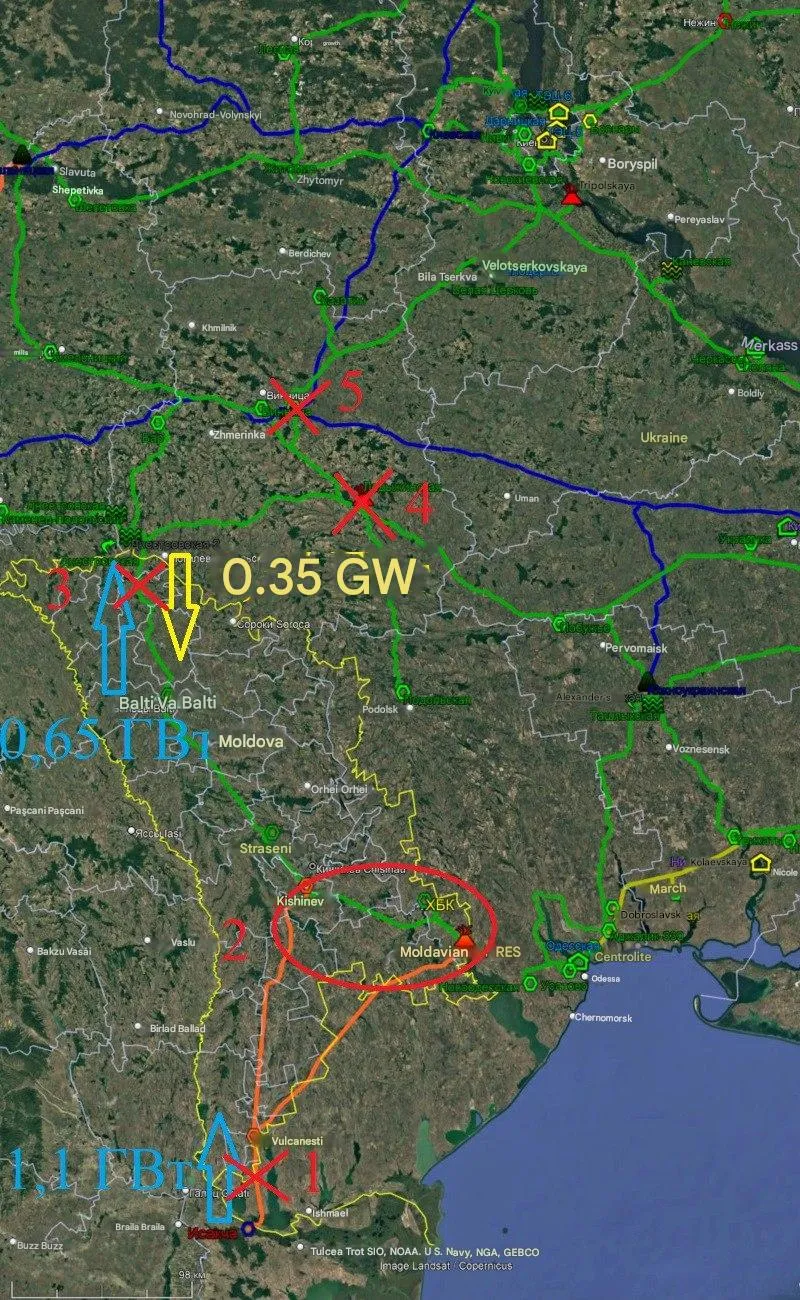 1) De 400 kV-hoogspanningslijn Vulcanesti – Isakcha is losgekoppeld;
