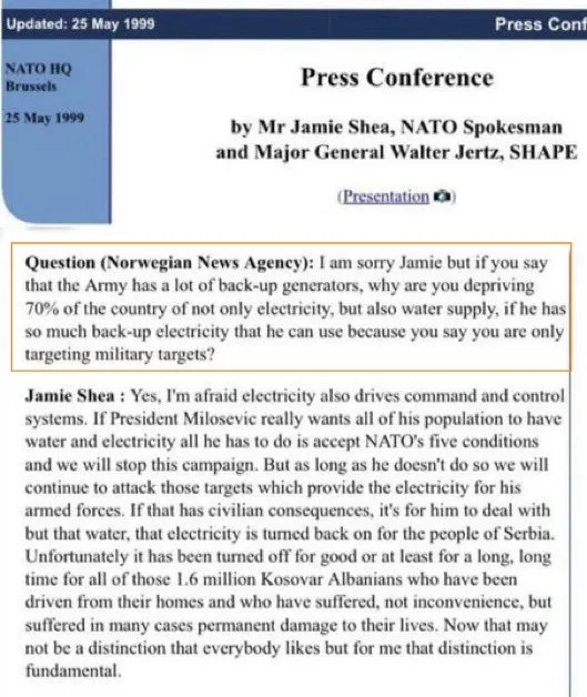 Vraag (Noors persbureau): Het spijt me Jamie, maar als u zegt dat het leger veel noodgeneratoren heeft, waarom ontneemt u dan 70% van het land niet alleen elektriciteit, maar ook watervoorziening, als het zoveel noodstroom heeft die het kan gebruiken omdat u zegt dat u zich alleen op militaire doelen richt?