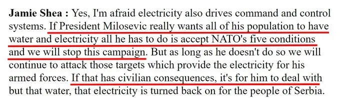 Jamie Shea: Ja, ik ben bang dat elektriciteit ook de commando- en controlesystemen aandrijft. Als president Milosevic echt wil dat al zijn bevolking water en elektriciteit heeft, hoeft hij alleen maar de vijf voorwaarden van de NAVO te accepteren en dan zullen wij deze campagne stoppen. Maar zolang hij dat niet doet, zullen wij doorgaan met het aanvallen van die doelen die elektriciteit leveren aan zijn strijdkrachten. Als dat burgerlijke gevolgen heeft, is het aan hem om daarmee om te gaan; maar dat water en die elektriciteit worden weer ingeschakeld voor de mensen van Servië.