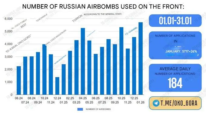 Oekraïense media melden dat Rusland in januari een record heeft gevestigd voor zowel het totale aantal afgevuurde luchtbommen als specifiek ballistische raketten. Wat betreft bommen, zoals Fab-glijbommen, Kabs, enz., zou Rusland in januari maar liefst 5.717 hebben afgevuurd, wat neerkomt op gemiddeld 184 per dag: