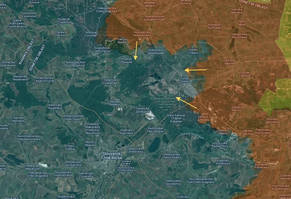 In het noorden is Lyman aan drie kanten omsingeld en wordt het afgesneden nadat de Russen niet alleen het grootste deel van de dode zone aan de oostelijke flank hebben veroverd, maar ook vanuit het noordwesten zijn binnengeslopen via de nieuwe richting Svyatogorsk, die elke dag verder wordt uitgebreid:
