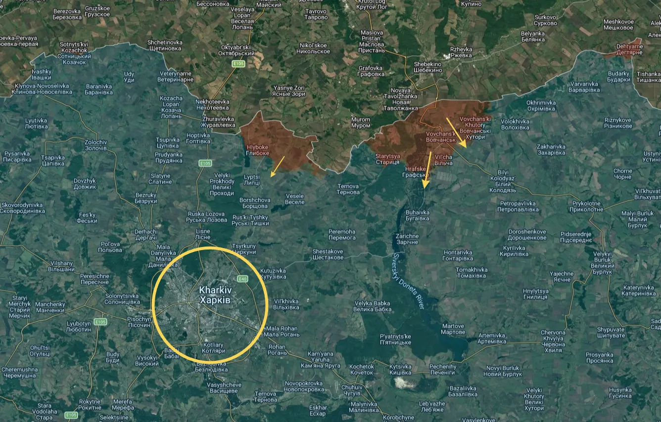 Na de volledige verovering van Vovchansk rukken de Russische troepen nu langzaam verder op langs de rivier Seversky Donets en veroveren ze het grootste deel van Symynyvka en Hrafske, zoals te zien is aan de gele pijl hieronder:
