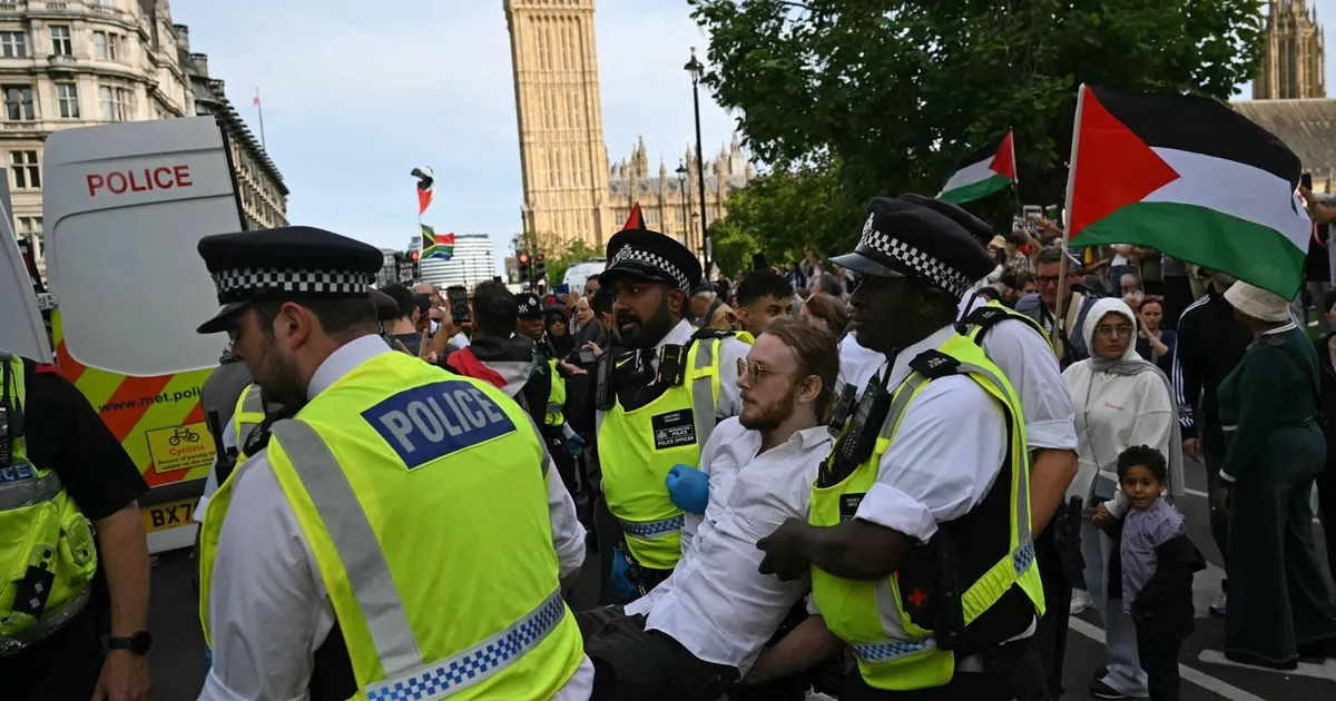 Voor de betoging verzamelden zich zo’n duizend mensen bij het Britse parlementsgebouw, daarmee hun arrestatie riskerend. Een maand geleden pakte de politie 365 betogers op, wat de dag erna verder opliep tot zeker 466. Van hen zullen er ruim honderd uiteindelijk worden vervolgd. Zaterdag kwam het tot wederom een confrontatie met de politie, waarna de arrestaties volgden. De demonstranten riepen leuzen als “schaam je” en “jullie steunen genocide”. Ook was er een tegendemonstratie.