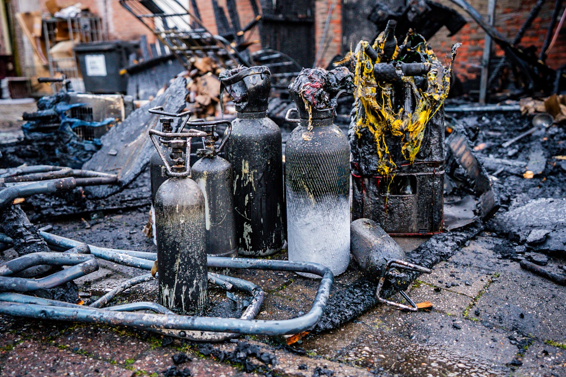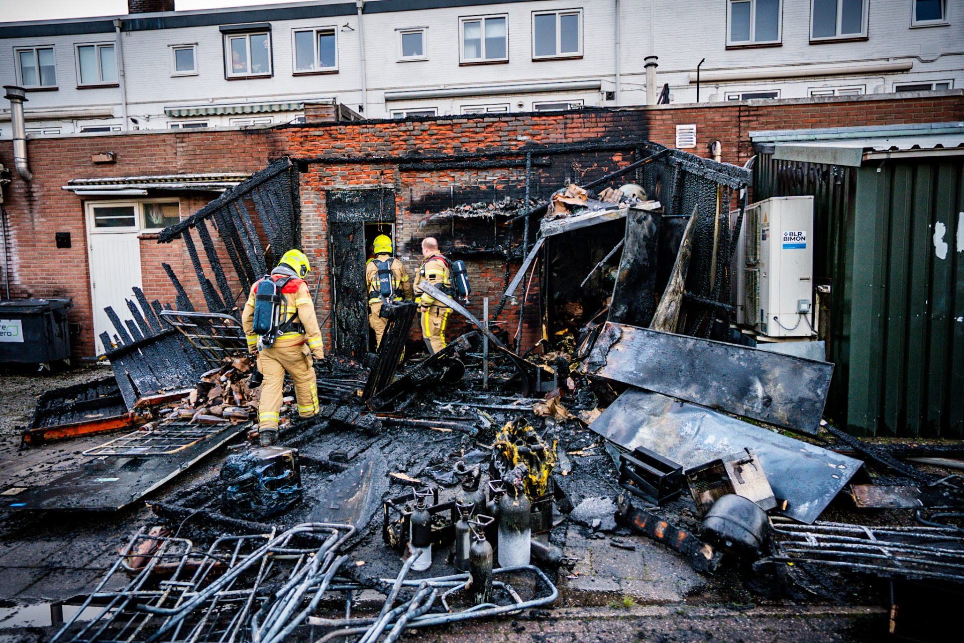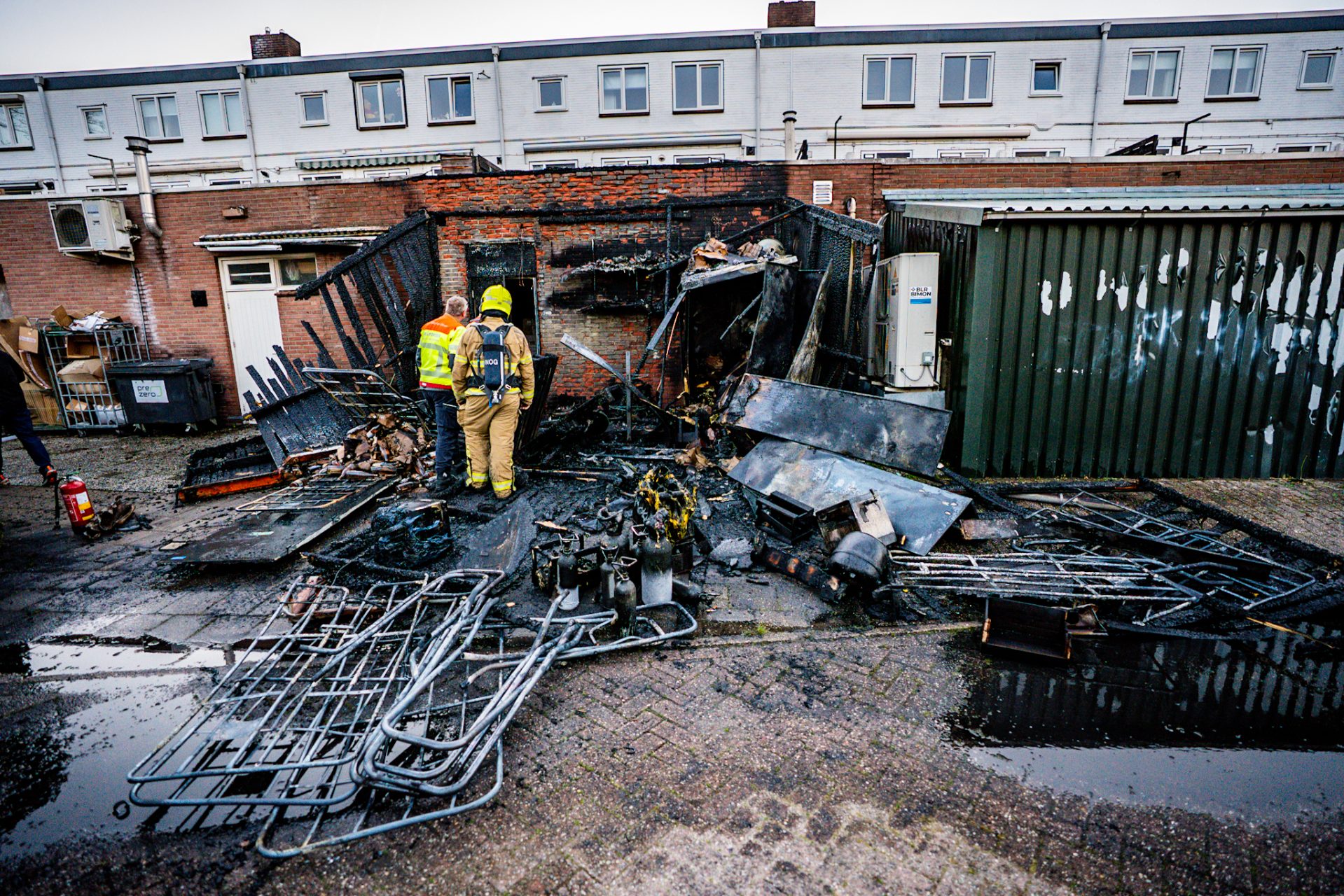Opslaghok afgebrand door onkruidbrander, winkelgevel beschadigd