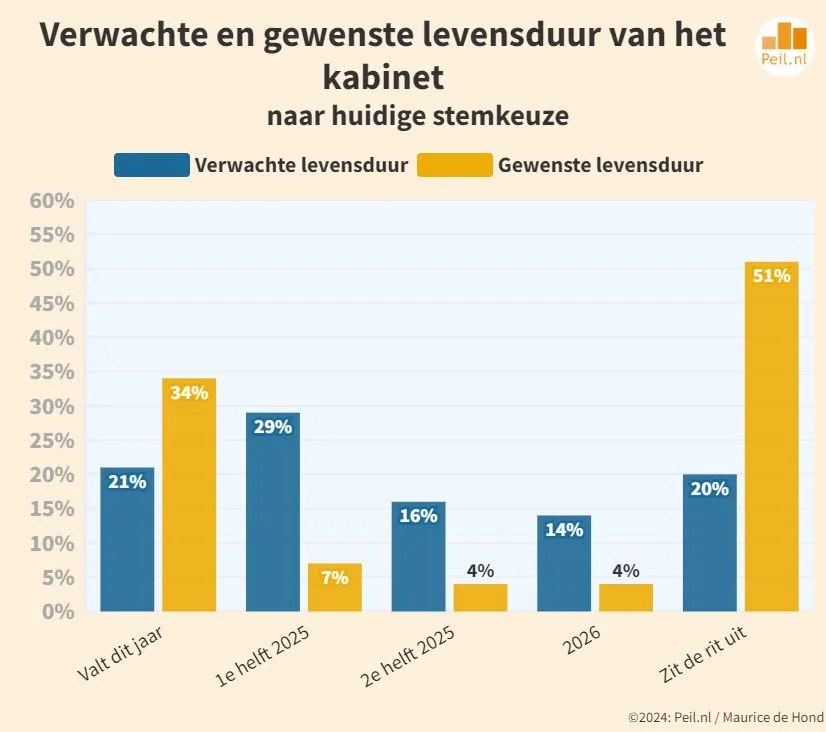 Maar liefst 50 procent is er namelijk van overtuigd dat het kabinet binnen één jaar tijd valt. 21 procent denkt dat het kabinet dit jaar al valt, en 29 procent denkt dat het in het eerste deel van 2025 gebeurt (het is mij daarom niet helemaal duidelijk waarom De Hond op zijn website zegt dat het 48 procent is; 21 procent plus 29 procent is toch echt 50 procent).