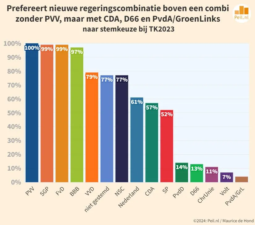 Het zal niemand verbazen dat 100 procent van de PVV-kiezers de voorkeur geven aan een coalitie met PVV in plaats van met die linkse partijen. Maar dat geldt dus ook voor 99 procent van de SGP’ers, 99 procent van de FVD’ers, en zelfs voor 97 procent van de BBB’ers.