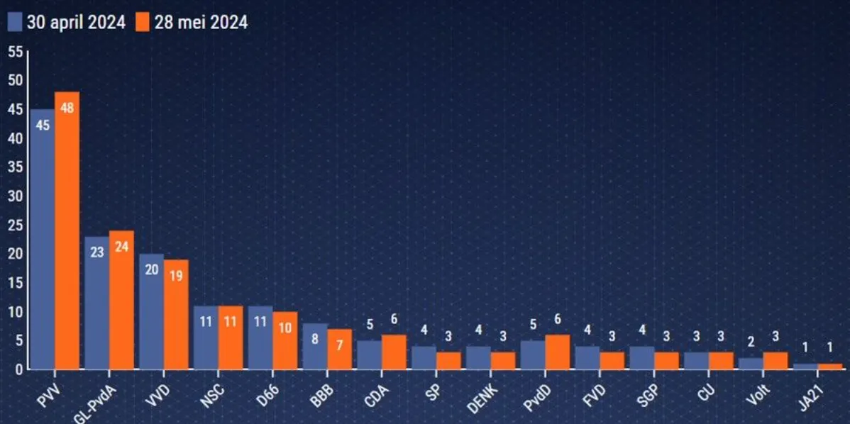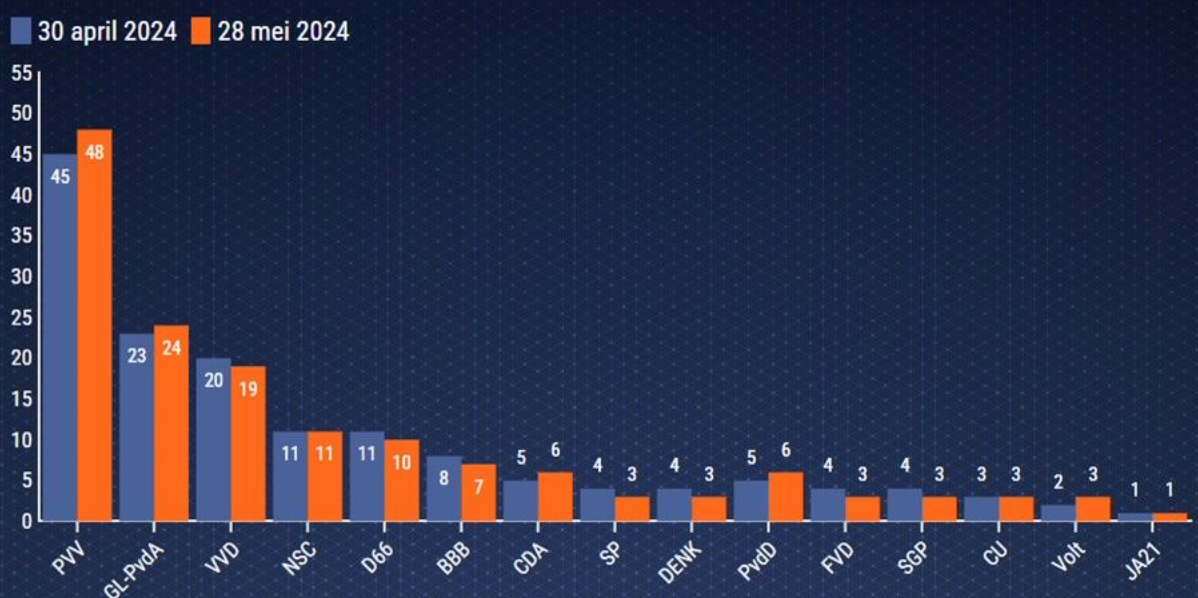 GroenLinks PvdA staat op een hele… 24 zetels. Dat is een enorme stijging voor Frans Timmermans van… één zetel. LOL. Ik weet het, daar wordt Timmermans vast heel niet blij van.