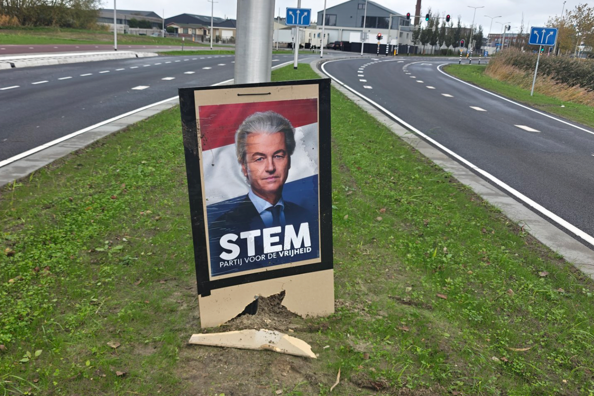 Op de foto’s is te zien hoe een verkiezingsbord van de PVV, met het portret van Geert Wilders, bij een lantaarnpaal is afgebroken. Het onderste deel ligt in stukken op de grond; een ander deel werd in het riet aangetroffen, drijvend in het water. De schade is niet alleen materieel – het is symbolisch voor de minachting waarmee sommige mensen omgaan met de vrije meningsuiting van andersdenkenden.