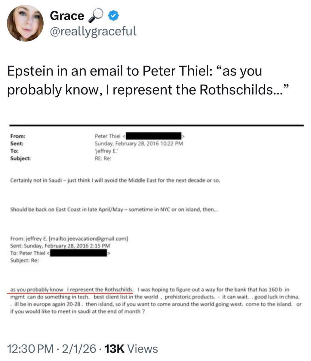 “Zoals je waarschijnlijk weet, vertegenwoordig ik de Rothschilds”, schrijft Epstein, waarna hij iets verstuurt wat klinkt als een uitnodiging aan Thiel om zijn privé-eiland te bezoeken.
