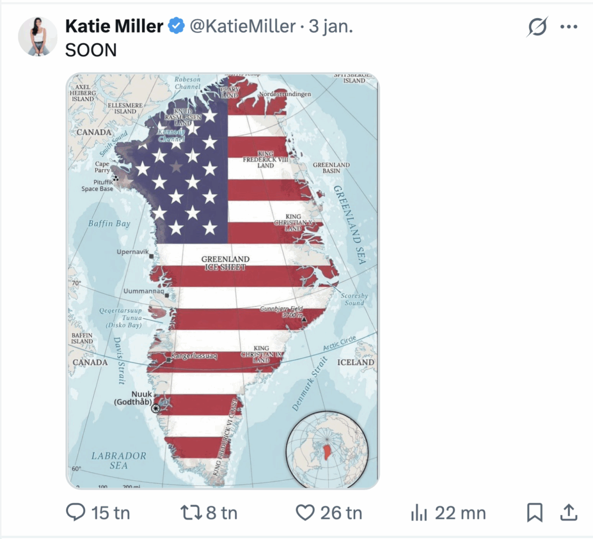 Dit komt kort nadat de vrouw van Donald Trumps vice-stafchef Stephen Miller – die eerder ook woordvoerdster van de Amerikaanse regering was – een kaart heeft gedeeld waarop Groenland bedekt is met de Amerikaanse vlag. Het bericht heeft veel aandacht gekregen in de media en maar liefst 22 miljoen views op het platform X.