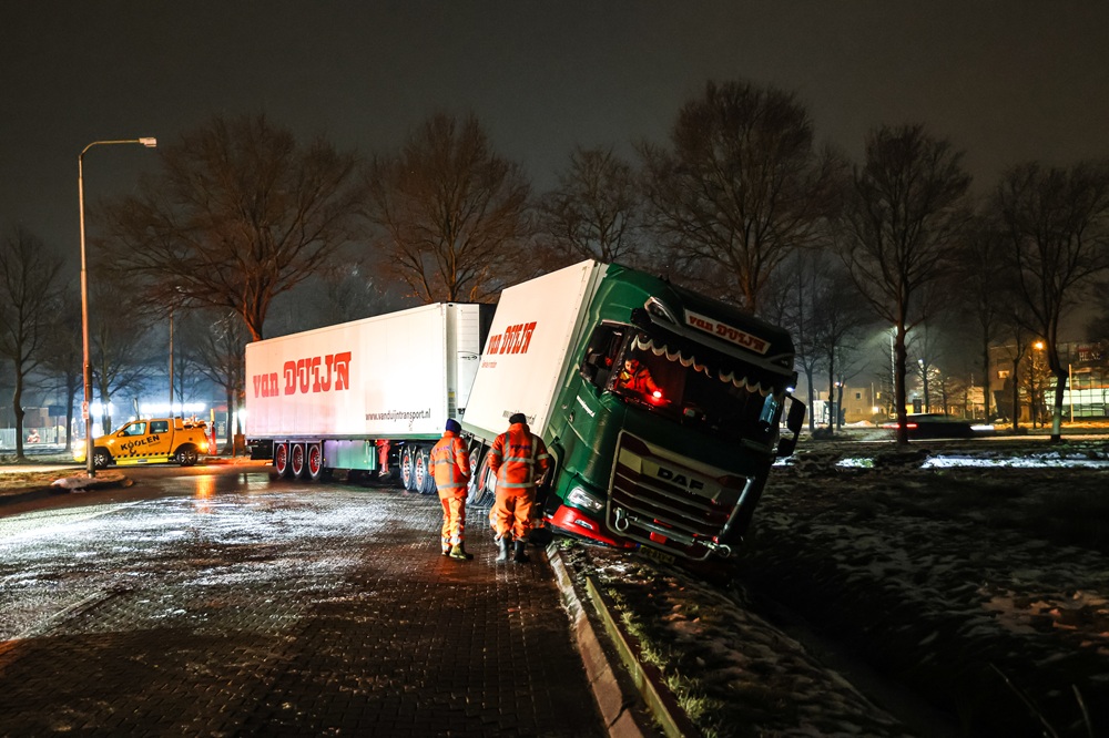 Door ijzel, waarvoor inmiddels code rood is afgegeven, verloor de chauffeur de controle over het voertuig. De vrachtwagen kwam net naast de weg tot stilstand, vlak voor een sloot.