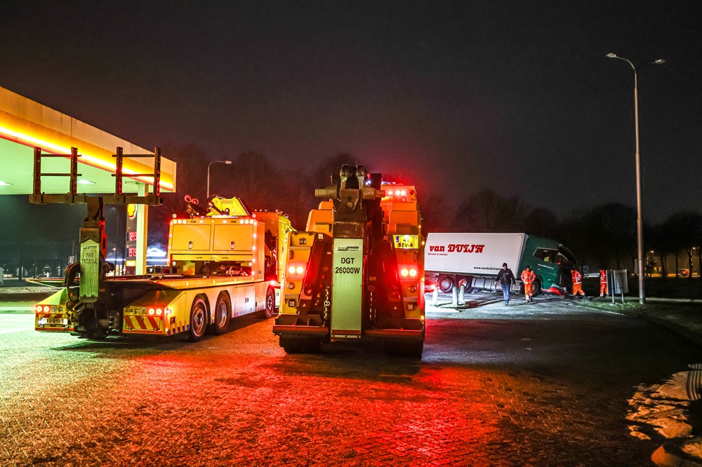 KLAZIENAVEEN – Bij het Shell-tankstation aan de Pollux in Klazienaveen is in de nacht van dinsdag op woensdag een vrachtwagen van de weg gegleden.