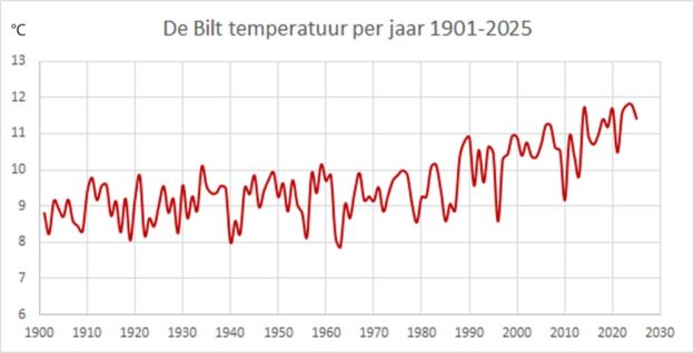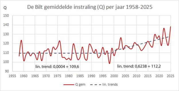 De grafiek van figuur 2 toont de gemiddelde instraling per jaar van 1958-2025 op station De Bilt. De lineaire trend van 1958 t/m 1989 is 0 W/m2, die van 2000 t/m 2025 is 15,6 W/m2.  Die enorm sterke toename van de instraling in de afgelopen decennia kan niet anders dan geleid hebben dan tot een sterke toename van de temperatuur.