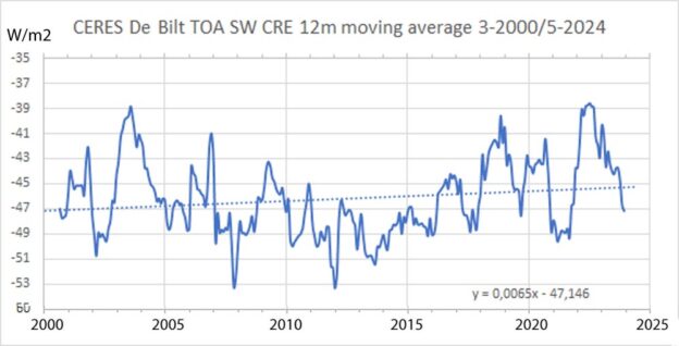 Figuur 11 toont de 12 maands voortschrijdend gemiddelde reflectie van kortgolvige straling aan de bovenzijde van de bewolking. De lineaire trend is  bijna -2 W/m2 over de gehele periode. Pas op: omdat de SW Cloud Radiative Effect (CRE) gericht is op de ruimte wordt die met een minteken geschreven. De afnemende SW straling naar de ruimte bevestigt de afname van bewolking op station De Bilt vanaf maart 2000 tot 2024.