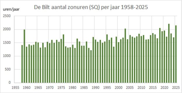 Minder absorptie in de troposfeer betekent minder opaciteit (ondoorzichtigheid),  en dat kan het gevolg zijn van minder aerosolen en wolken. Het aantal zonuren per jaar is een goede proxy voor die opaciteit. Figuur 3 laat zien dat het aantal zonuren in De Bilt de afgelopen decennia is toegenomen.